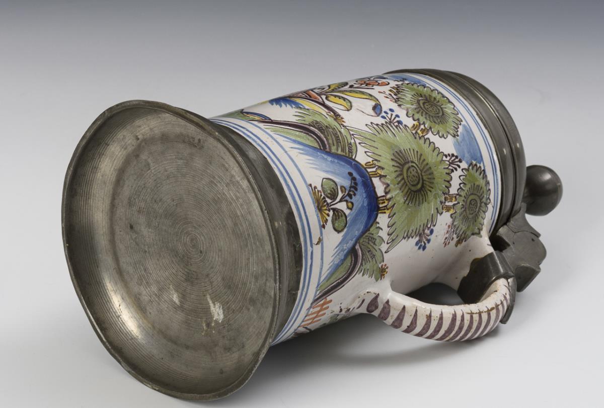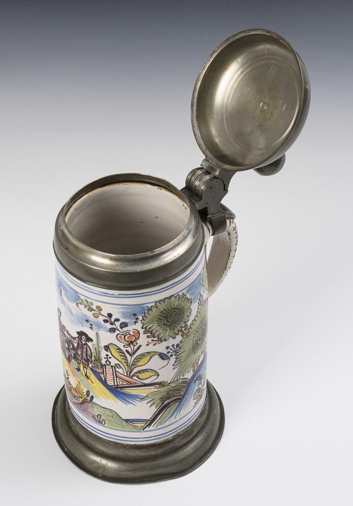 Narrow, cylindrical body with decorated band handle, 2 winegrowers with barrels in a colorful landscape on the front. Profiled pewter lid with ball finial, engraved "MSF 1778", pewter stand. Minimal signs of age and use.