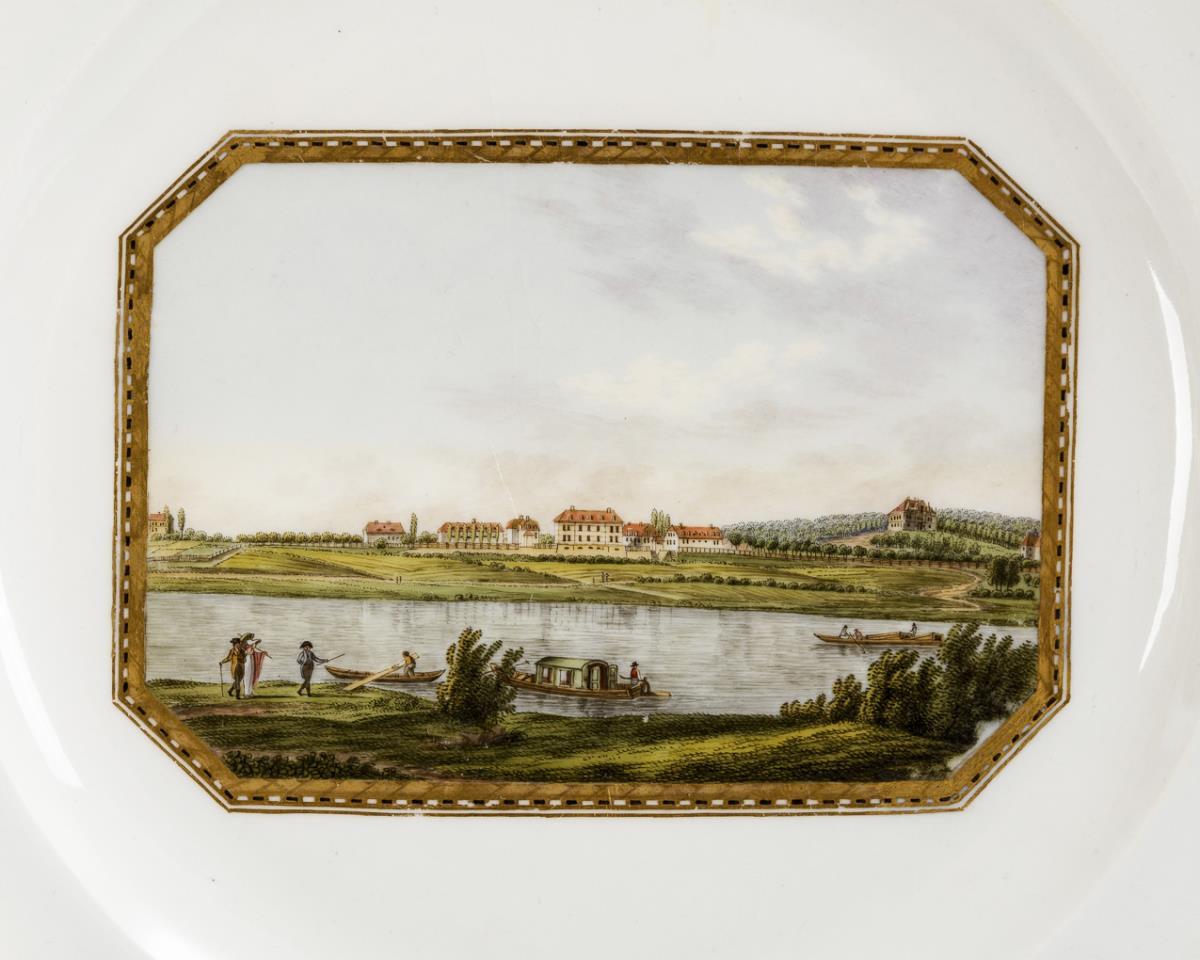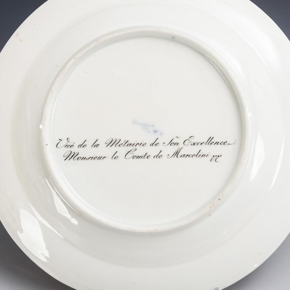 In the mirror of the plate a landscape view with a view of the dairy of Camillo Count Marcolini, inscribed on the underside "Vue de la Métairie de Son Excellence Monsieur la Comte de Marcolini". Hairline crack on the rim, hairline crack in the mirror.