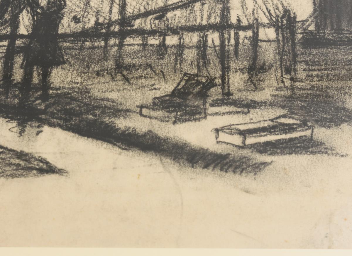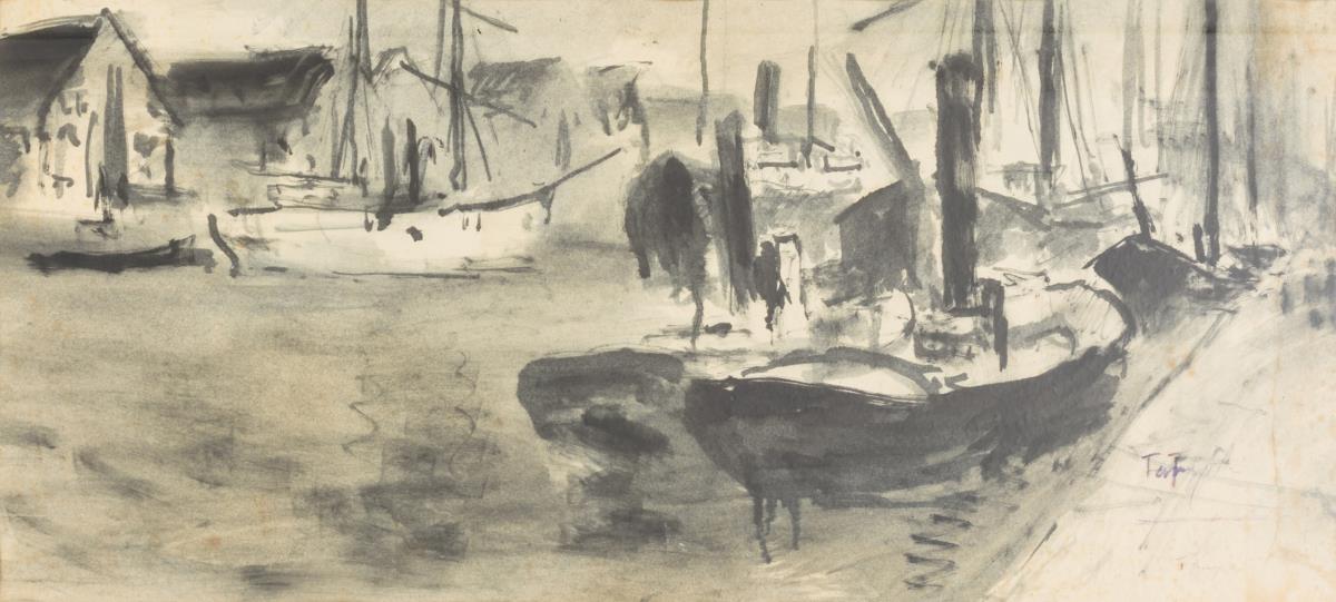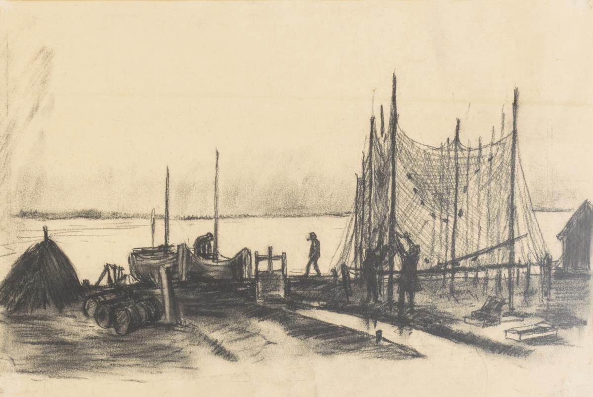 Kohlezeichnung: Hafenszene mit Fischernetzen, Passepartoutausschnitt 27,5 x 40 cm | Aguarell: Fischerboote im Hafen, Passepartoutausschnitt 24 x 52 cm.