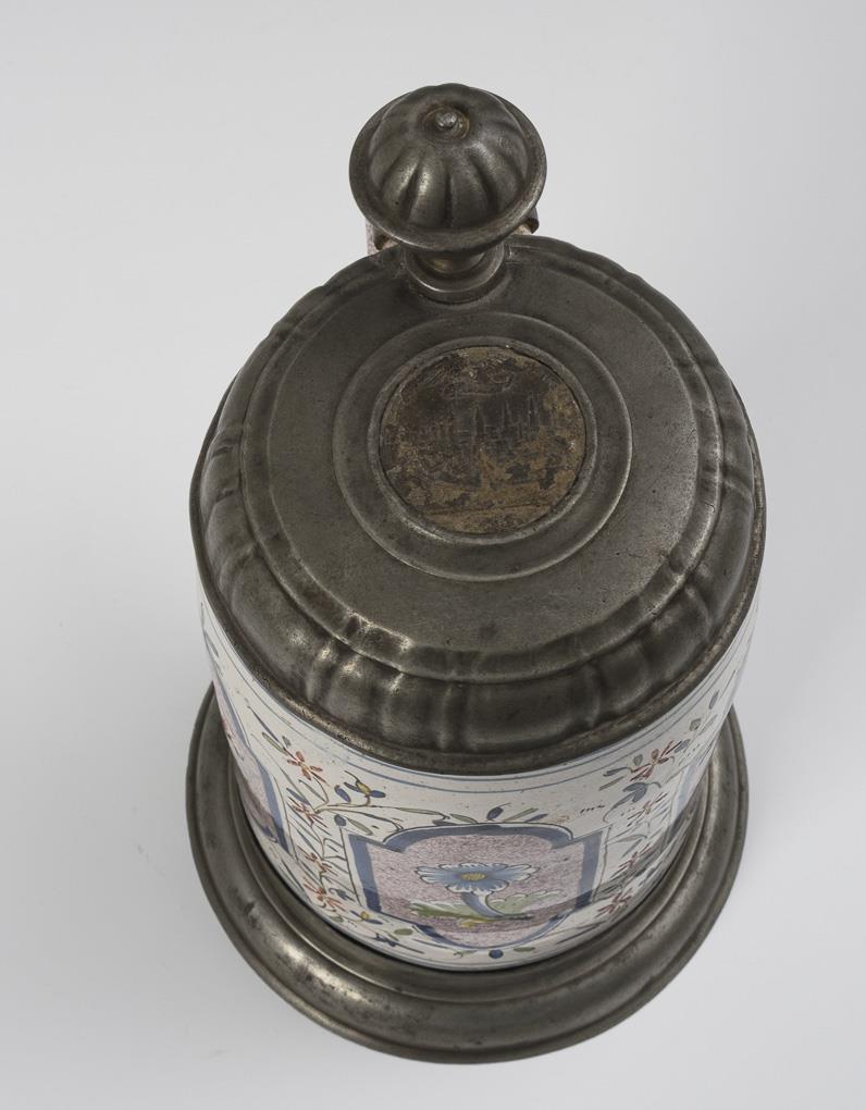 Cylindrical body with ribbon handle, surrounding baroque reserves with flower painting and tendril decoration. Profiled pewter lid with inlaid relief plaque and ball finial, hallmarked inside, pewter stand. Slight glaze chips and rubbing in places, pewter with signs of age and small defects.