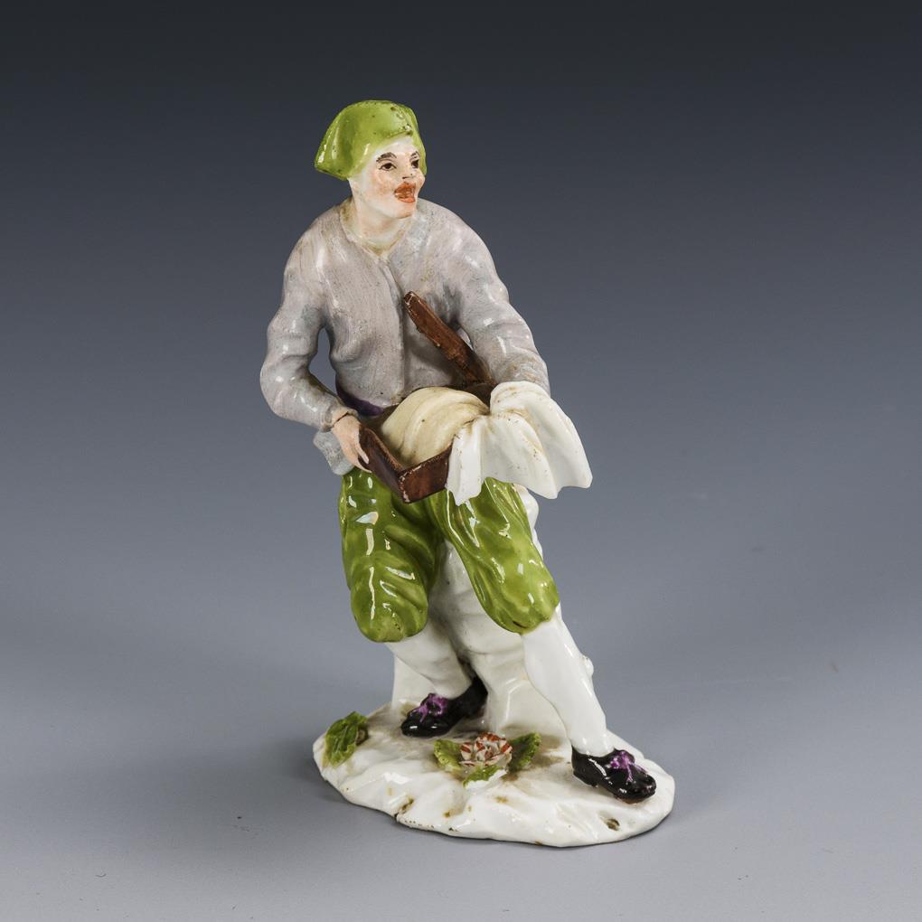 Small figure of a baker with a pastry on a tray. Leaves, cloth and stick chipped.