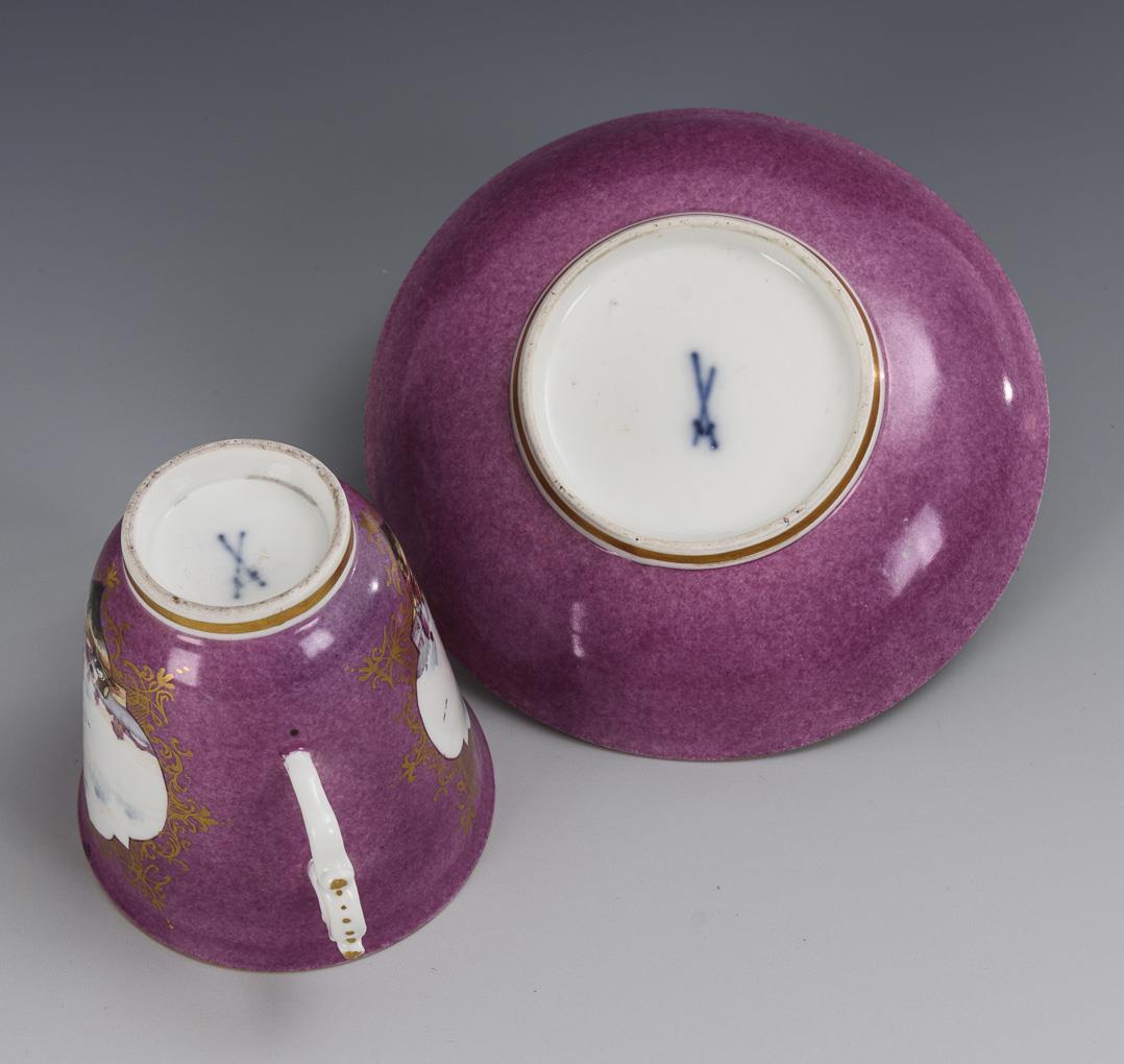 Bell-shaped cup with two rocaille handles. Purple ground, both sides and the mirror of the saucer depicting coastal landscapes with sailing ships, merchants and cargoes of goods.