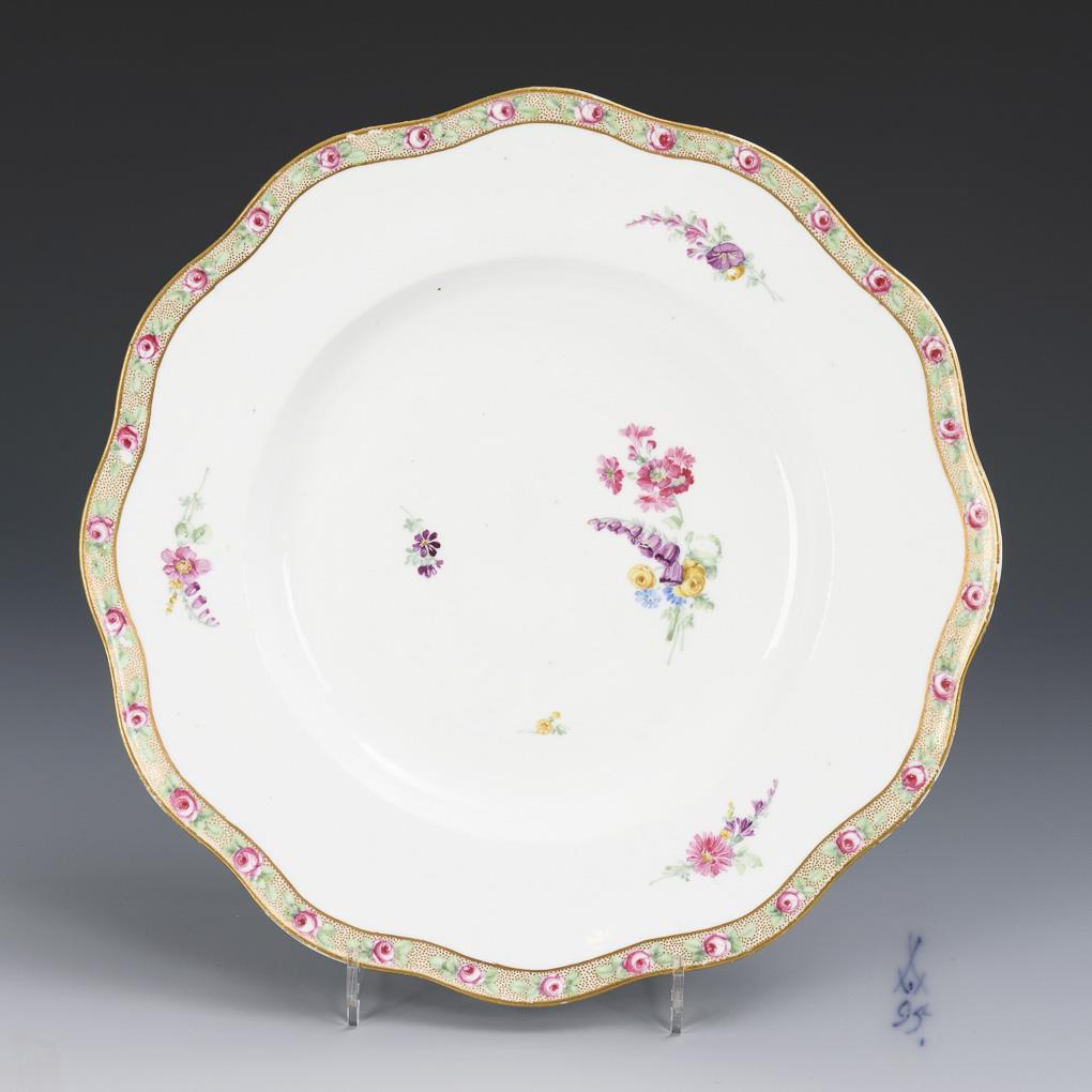 Multipass plate with rose border and a small bouquet of flowers on the mirror edge. Gold rim somewhat rubbed.