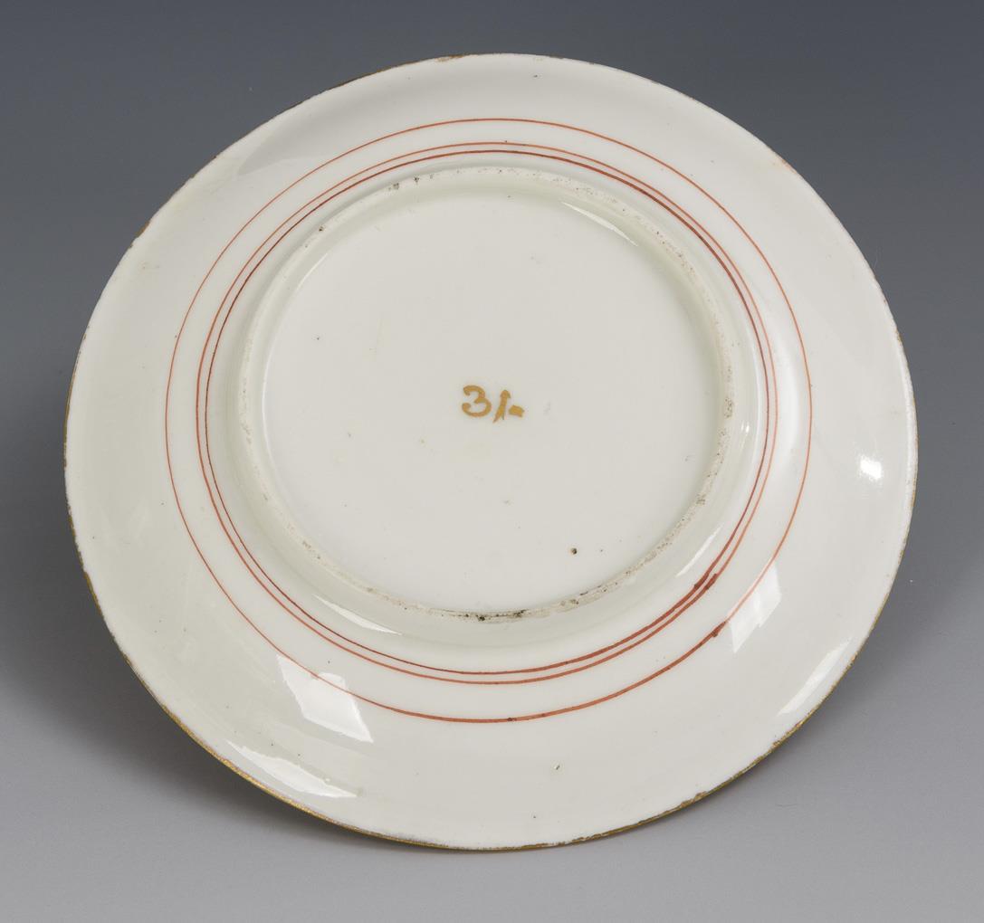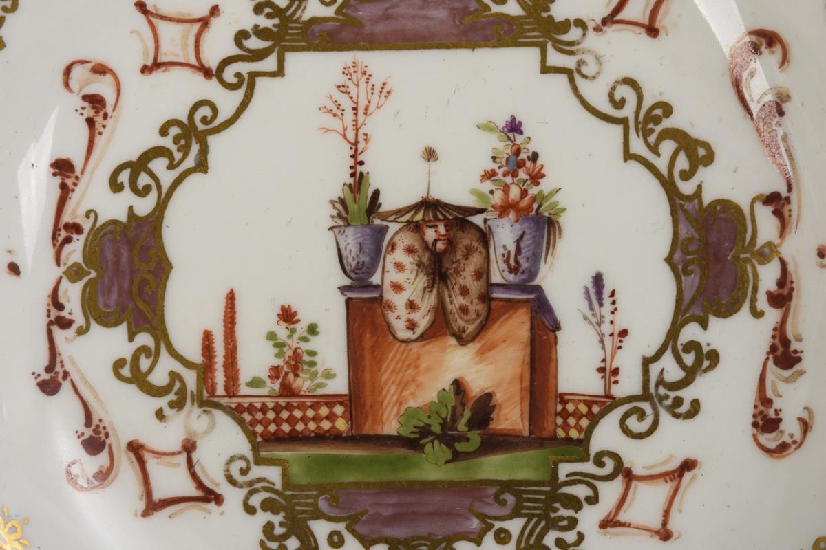 Saucer with gold lace border, in the mirror a cartouche depicting a Chinese man leaning on a plinth and looking into the landscape.