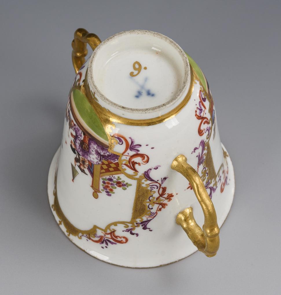 Bell-shaped goblet with two rocaille handles. A cartouche on both sides depicting a Chinese man sacrificing at the altar and a Chinese man with a boy at the brazier. 1 restoration to the rim, 2 small firing cracks inside (not throughout).