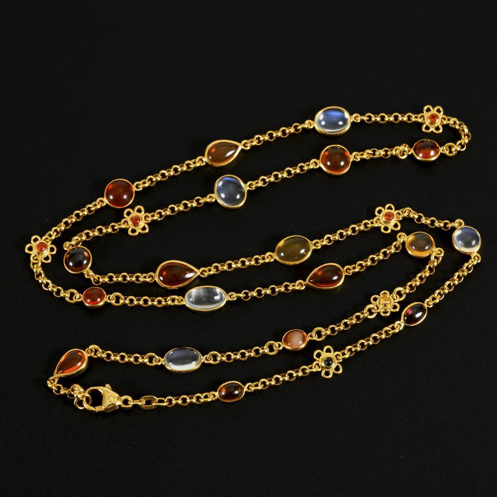 Bezel-set moonstone, fire opal and tourmaline cabochons between anchor chains, on lobster clasp.
