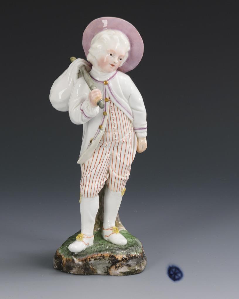 Boy carrying a cane with a linen bag and wearing a hat. Birdcage missing, left hand, hat, cane ends and jacket hem restored.