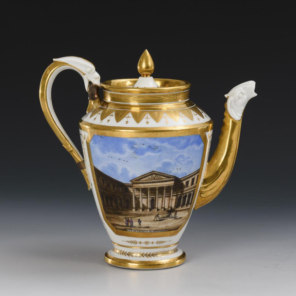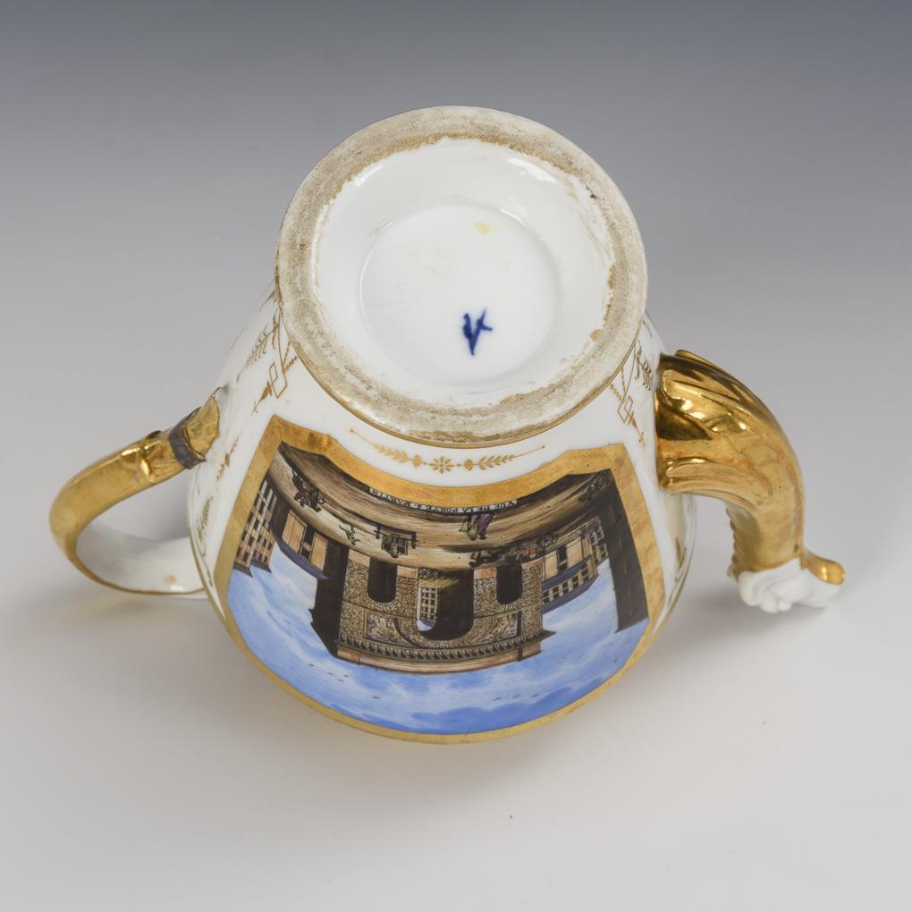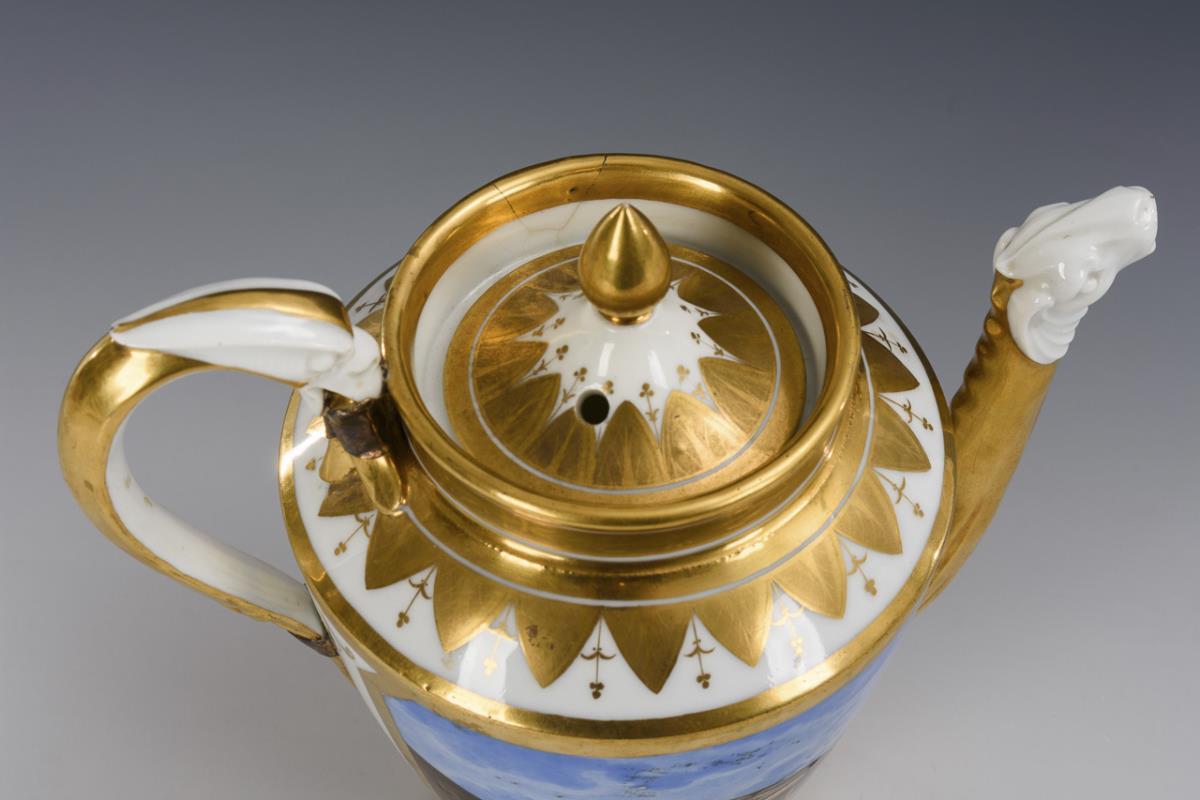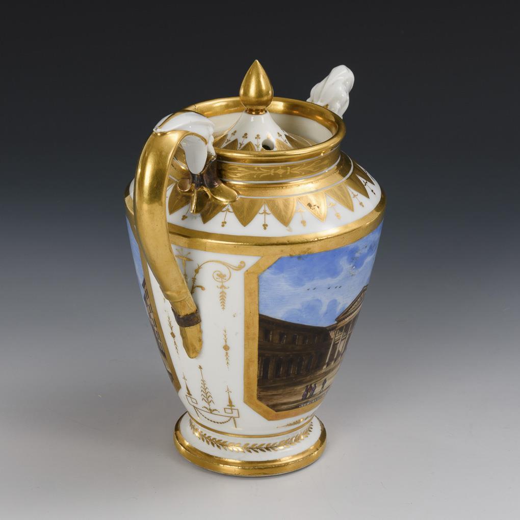 Empire jug with ovoid body, animal head spout, griffin handle and pommel lid. On both sides a rectangular cartouche with the inscribed views of the Porte Saint-Martin and École de Chirurgie in Paris. Glued edge breakage, handle repaired by old, bump on the inner rim of the jug.