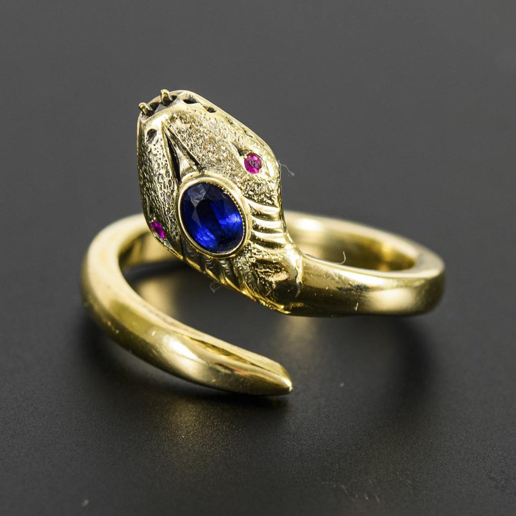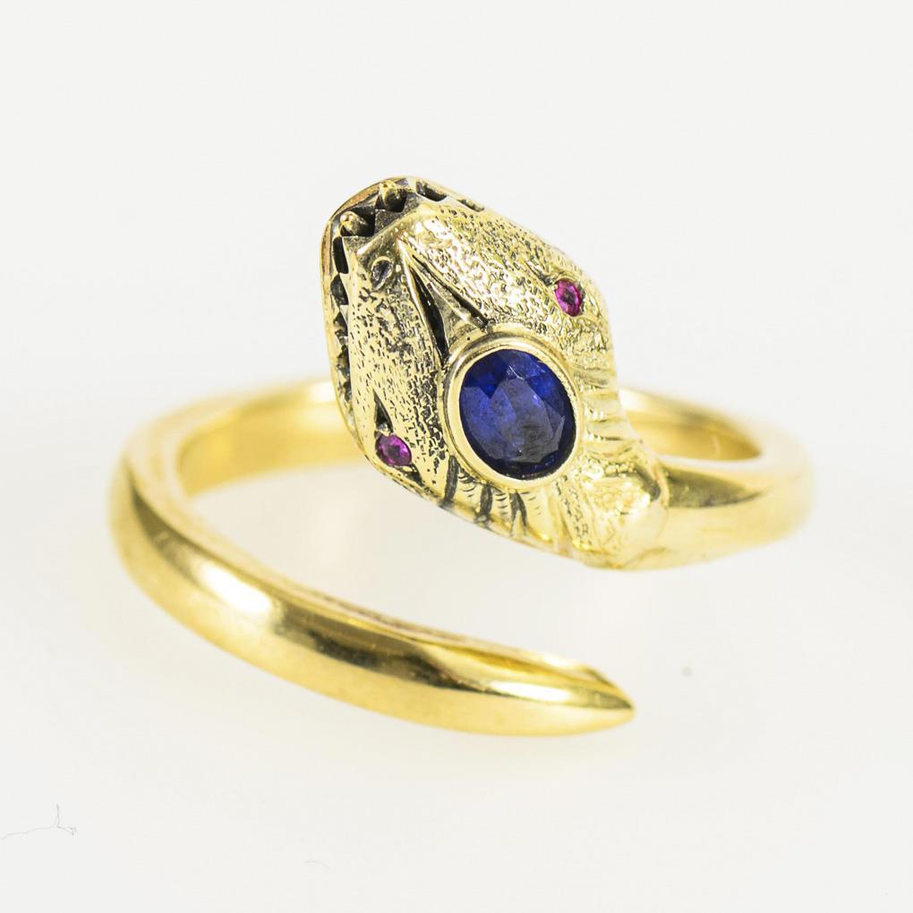 Snake head in relief with bezel-set sapphire, small ruby eyes and open, toothed mouth, between middle rail.