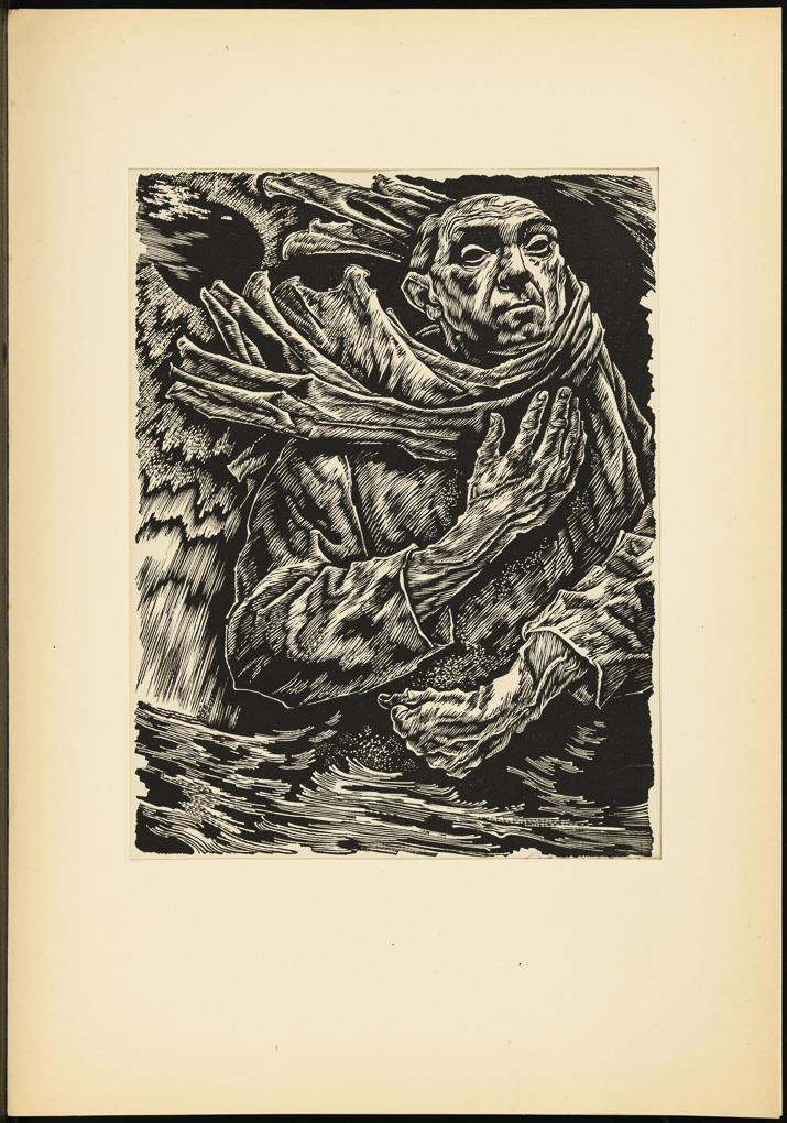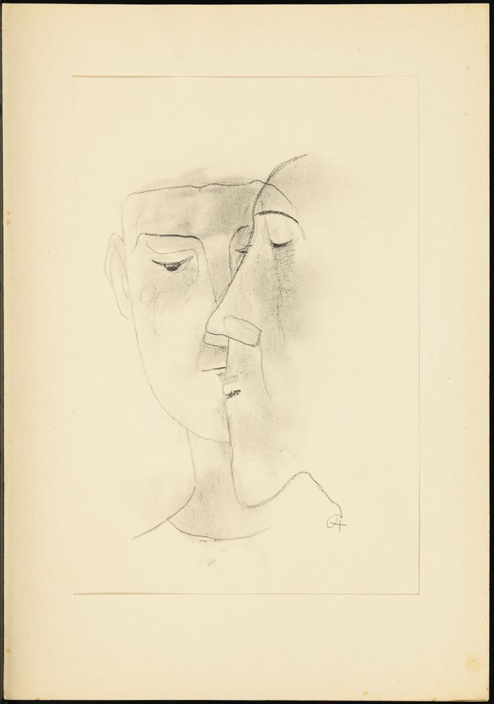 Portfolio with 21 facsimile collotype prints and 2 original prints from a total of 25 prints as a loose-leaf collection by 25 artists, including Carl Hofer, Karl Schmitt-Rottluff, Max Kaus and Gerhard Marcks; missing are no. 6 "Der Fuchs" by Renée Sintenis and no. 8 "Liebespaar" by Friedrich Stabenau, no. 13 "Männerkopf" by Hans Orlowski is a hand-signed original woodcut, no. 17 "Phantastisches Gerippe" by Karl Hartung is a hand-signed original lithograph; with typographical text booklet with imprint and table of contents, in original folder. Stock stains, folder with small defects.