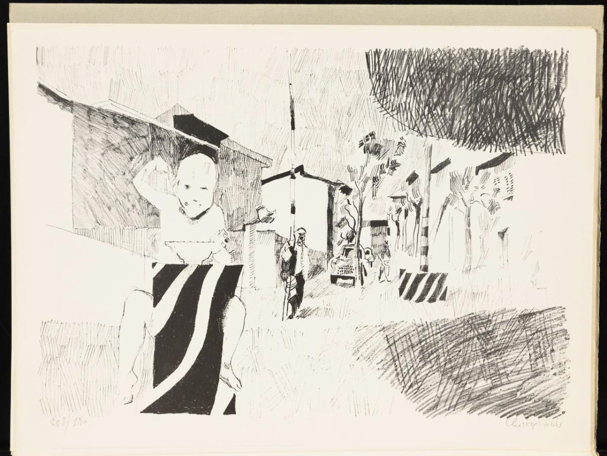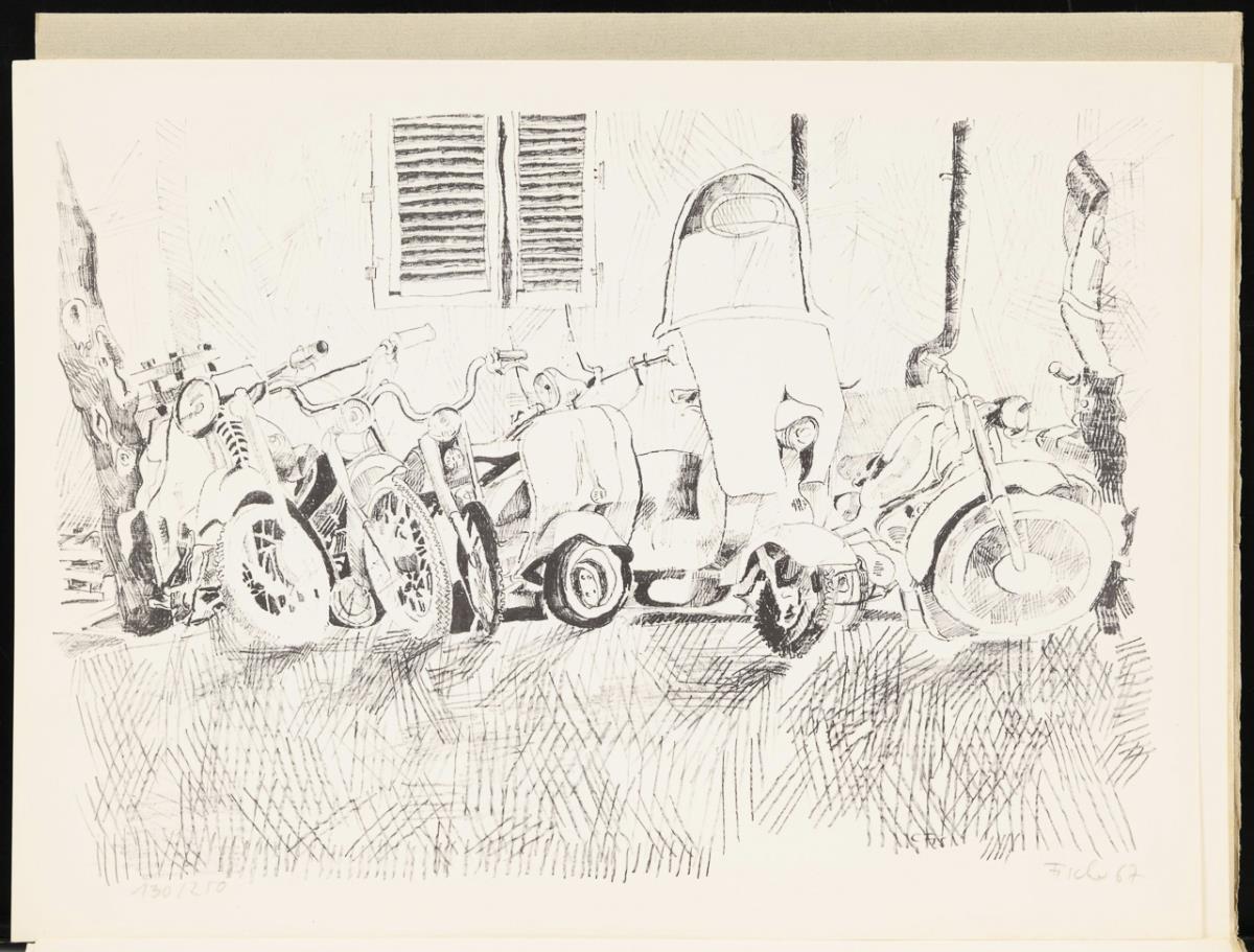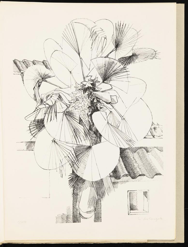 Portfolio with 7 of 9 loose lithographs, 1 color linoleum cut and 1 reproduction of a photograph of the city of Vinci/Italy, insert with greeting and pencil signature of Werner Schriefers, who was director of the Cologne Werkschulen until 1971; in original folding folder. Binding soiled, repro photograph with creases.