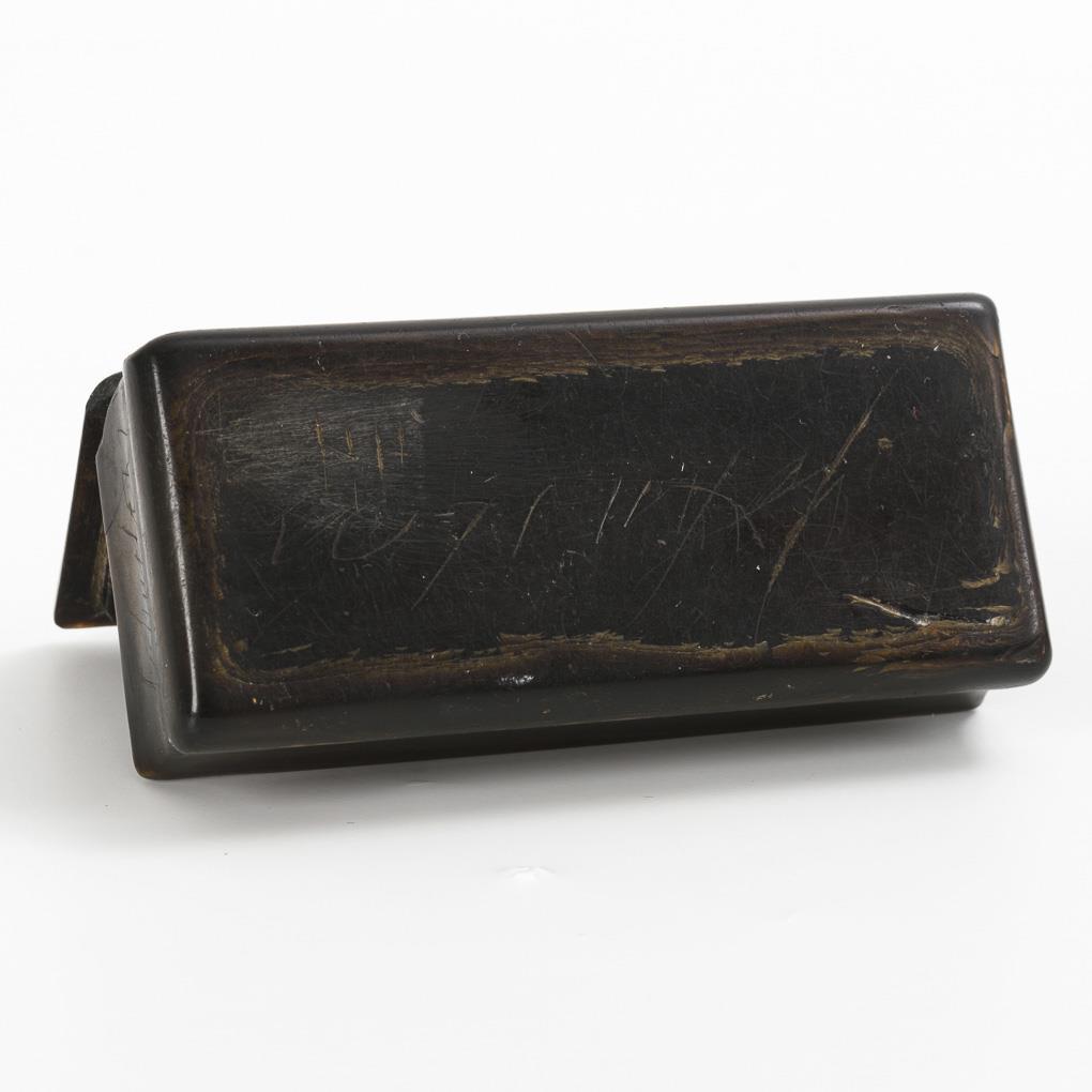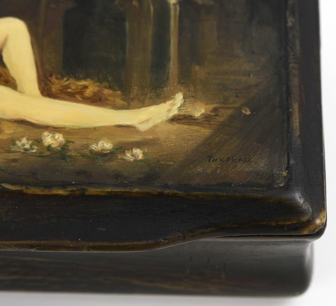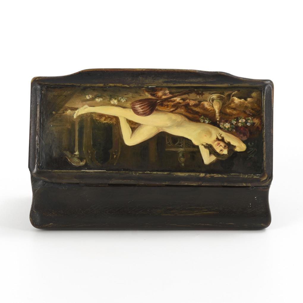 Tabatiere with curved walls. On the hinged lid the painted female nude of an odalisque; next to her a lute and at the foot a falcon. Probably Cyrillic incisions on all sides and also inside, otherwise hardly any signs of age/use.