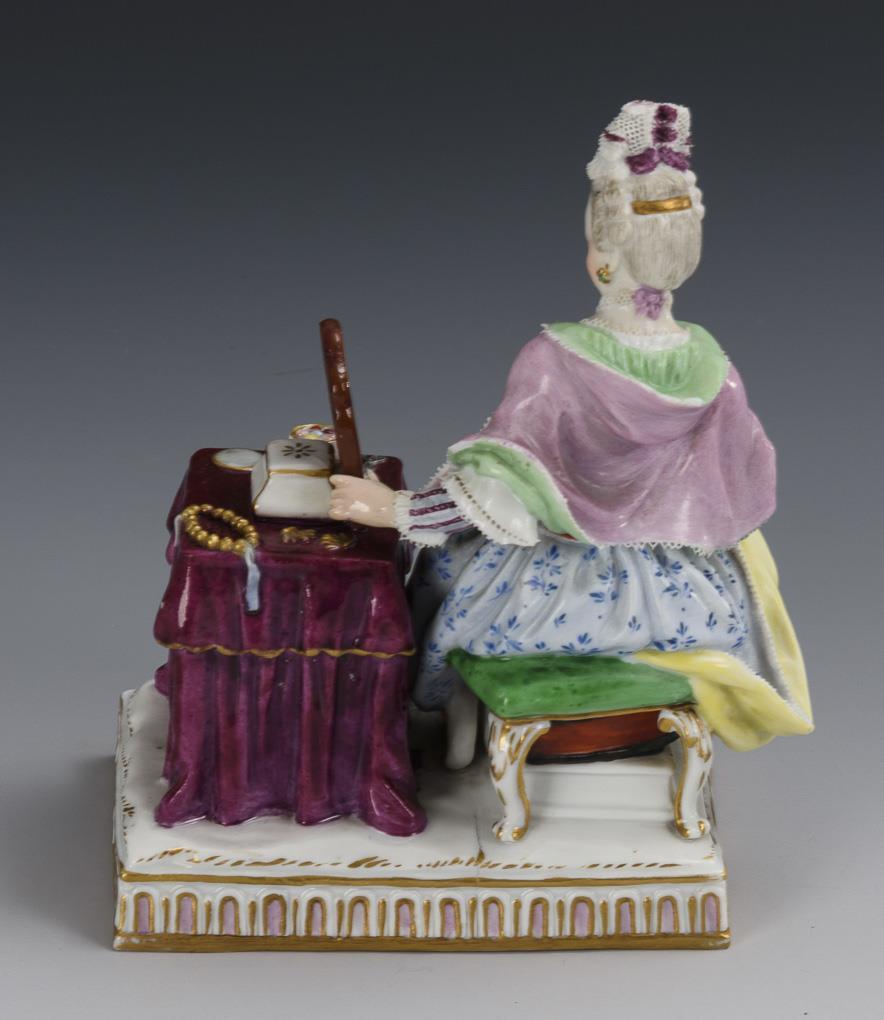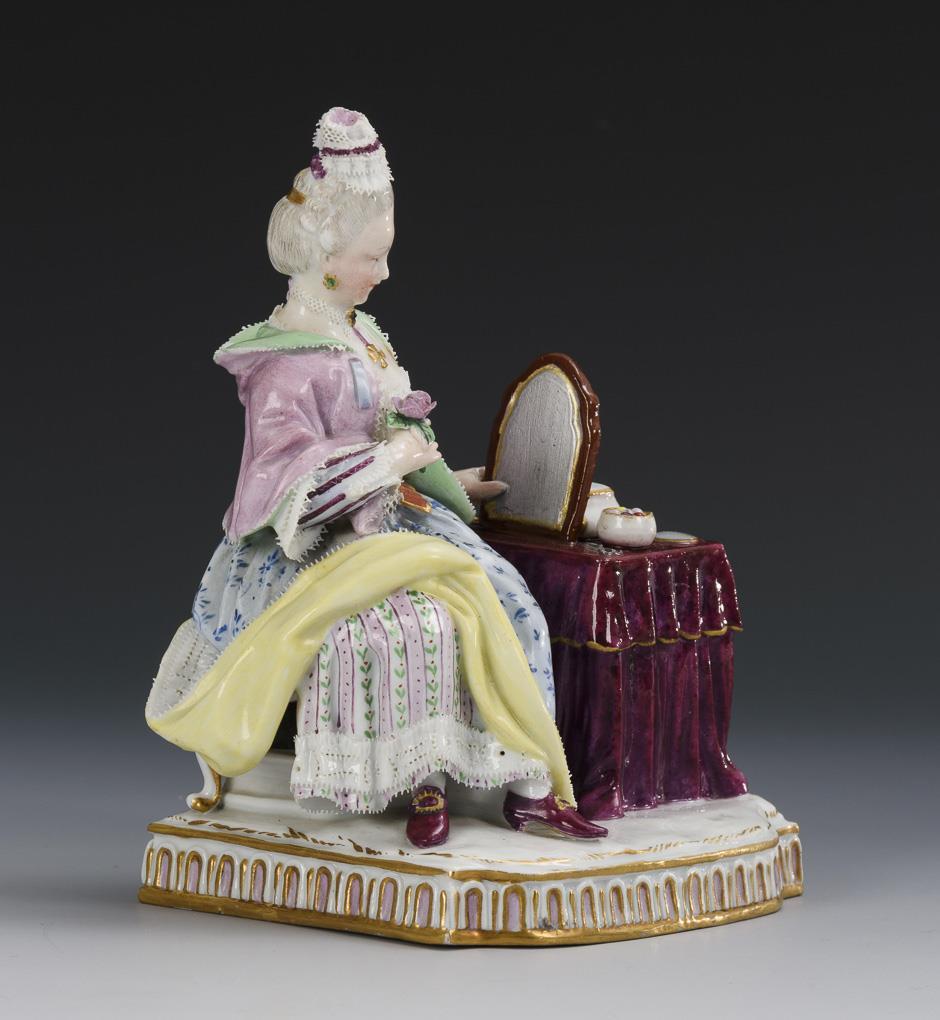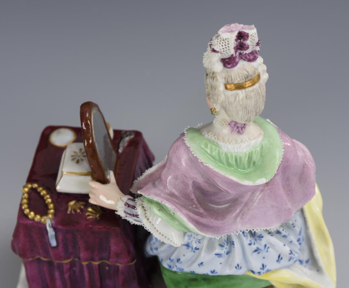 Allegory of seeing: Rococo lady sitting at a table and looking into a mirror. Mirror, top of table and lady's left hand restored, top partially chipped.