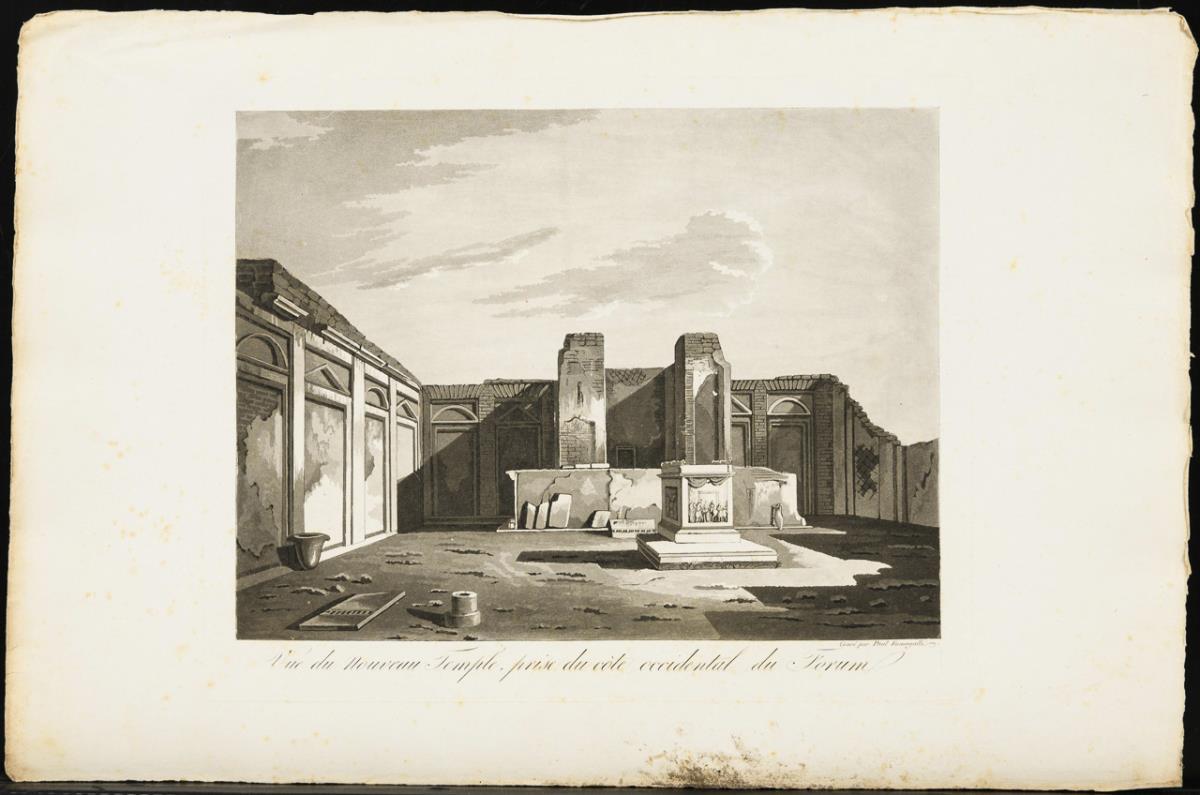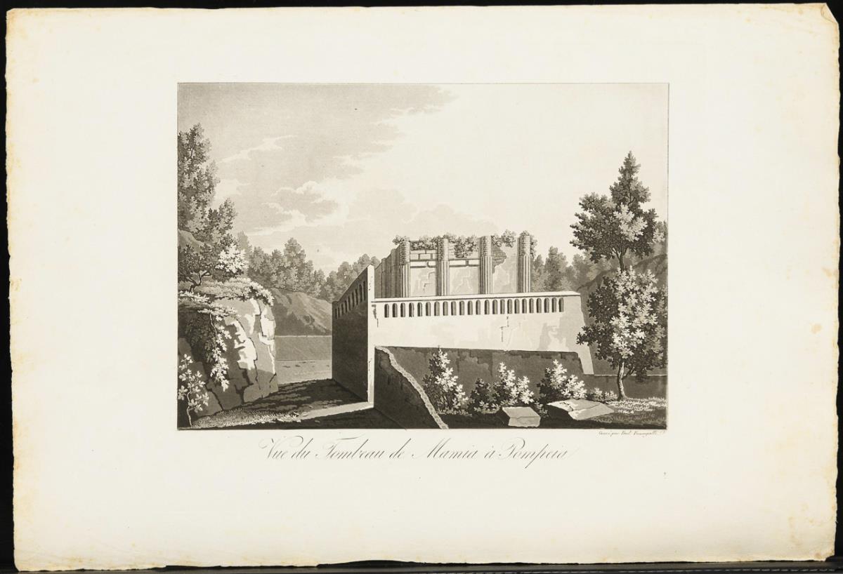 27 loose views, plans and illustrations of Pompeii from the portfolio "Pompeia. Trattato pittorico, storica, e geometrica. Opera designata negli anni 1824 al 1830 Incisa e pubblicata da P. F. Firenze", 1 title page; in non-original folding folder. Sheets more heavily foxed, partly cracked or creased.