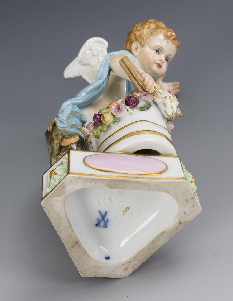 A Cupid boy with a torch standing by a ram's head bowl with roses and flaming hearts, the inscription "Je les enflammé.". 1 finger and a few flowers and leaves chipped.