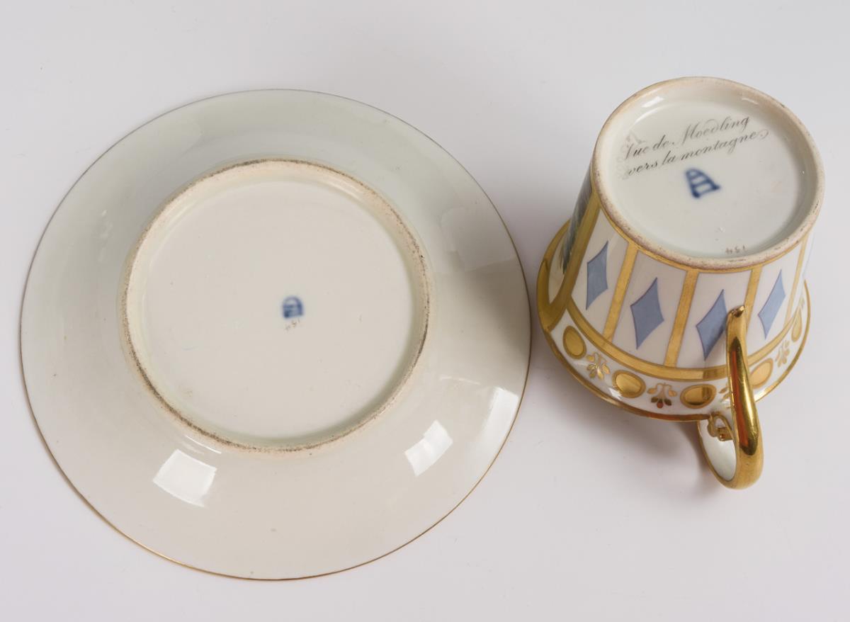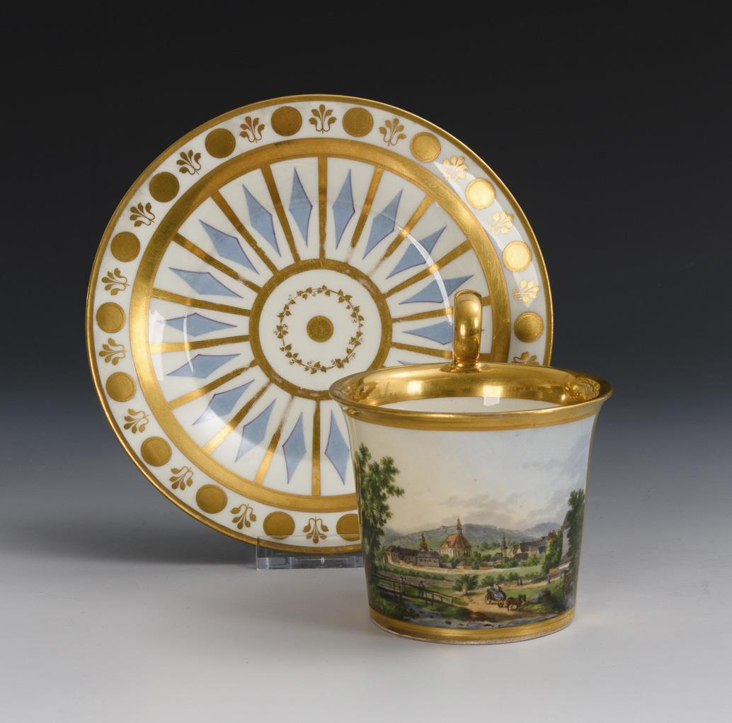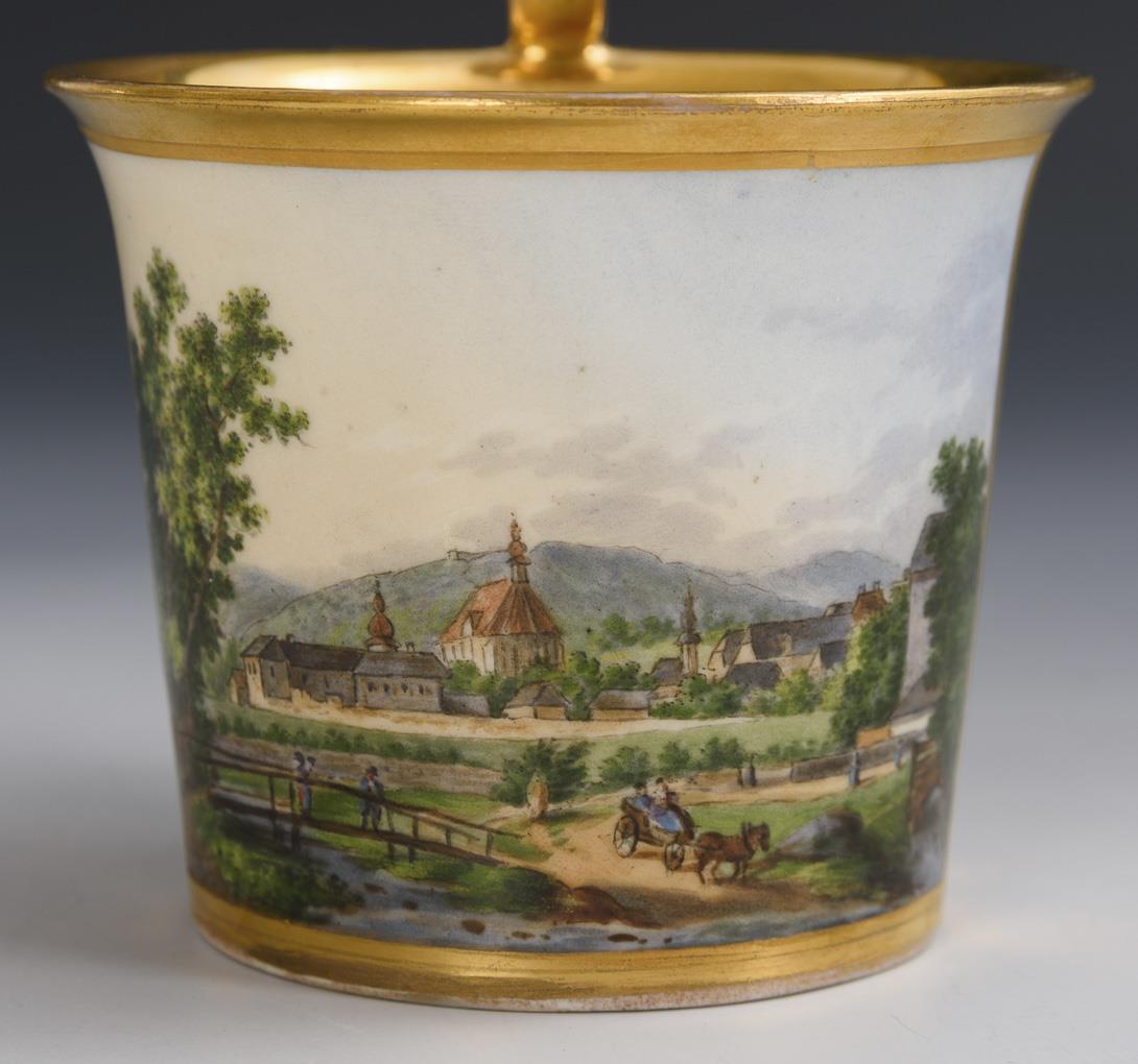 Cratered cup with high curved handle. On the front a gold-framed cartouche with a view of the municipality of Moedling near Vienna, inscribed on the underside "Vue de Moedling vers le Montagne", verso a pattern of light blue diamonds and gold lines.