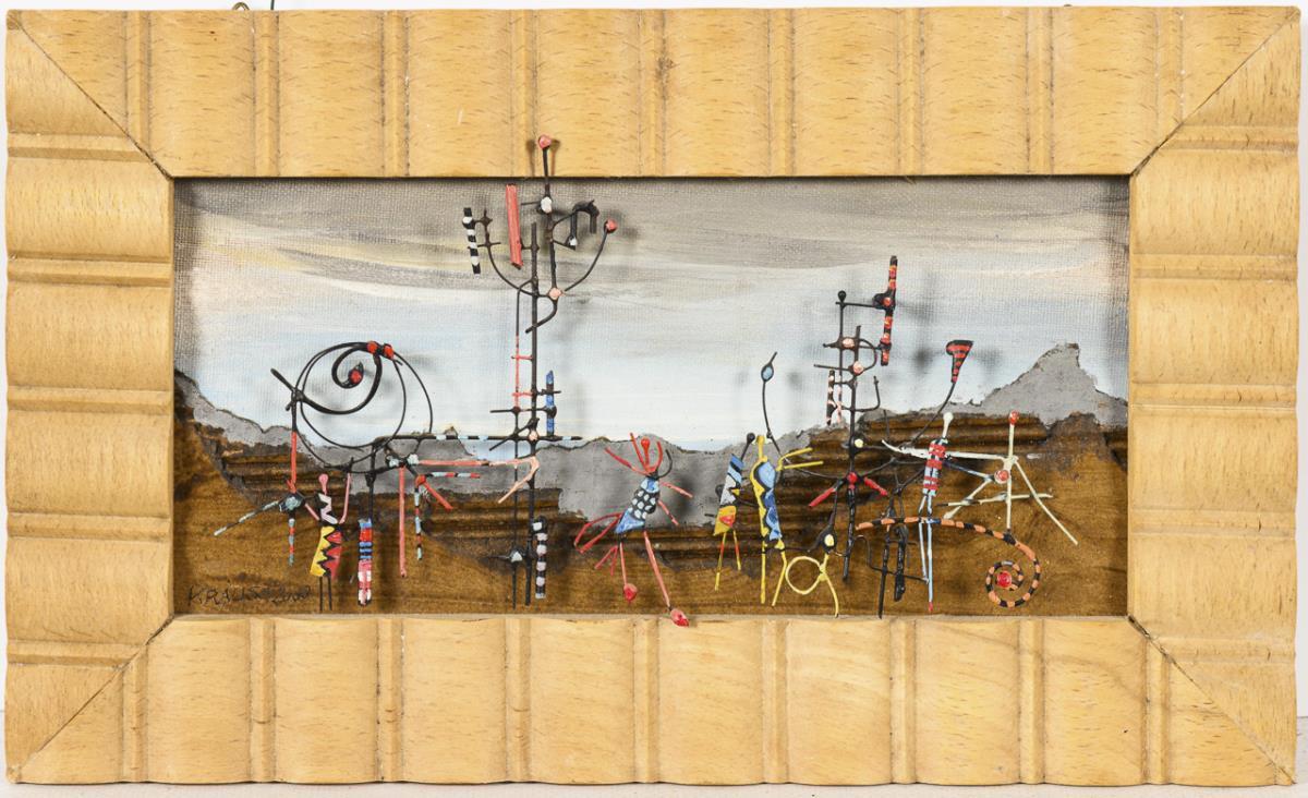 Mixed media/canvas/wood with figurative metal applications. Signed lower left, signed/titled on verso. 2009.