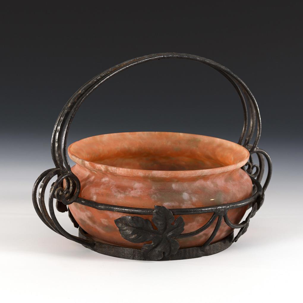 Pressed, bulging bowl in a holder with sculpted vine leaves and bow handle. Rim ground.