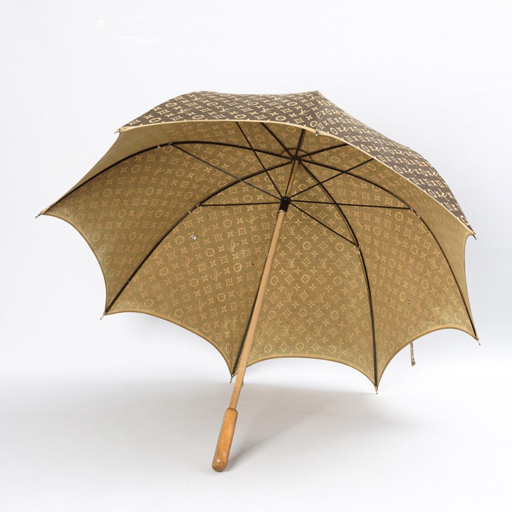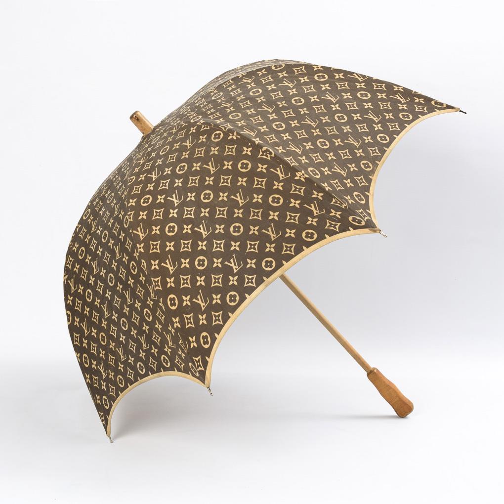 Flattened wooden handle, robust beige fabric printed brown on the outside with company logo and flowers in a repeat, wooden lace. 3 pinhole-sized holes, minimal signs of age/use.