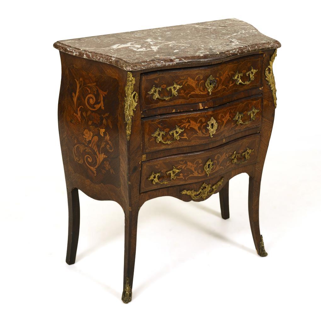 3-tier chest of drawers in a slightly curved shape, on 4 slightly flared legs; reddish, white-grey veined marble top, decorated with lavish bronze applications and rocaille marquetry . Veneer with defects, signs of age/use, locks loose.