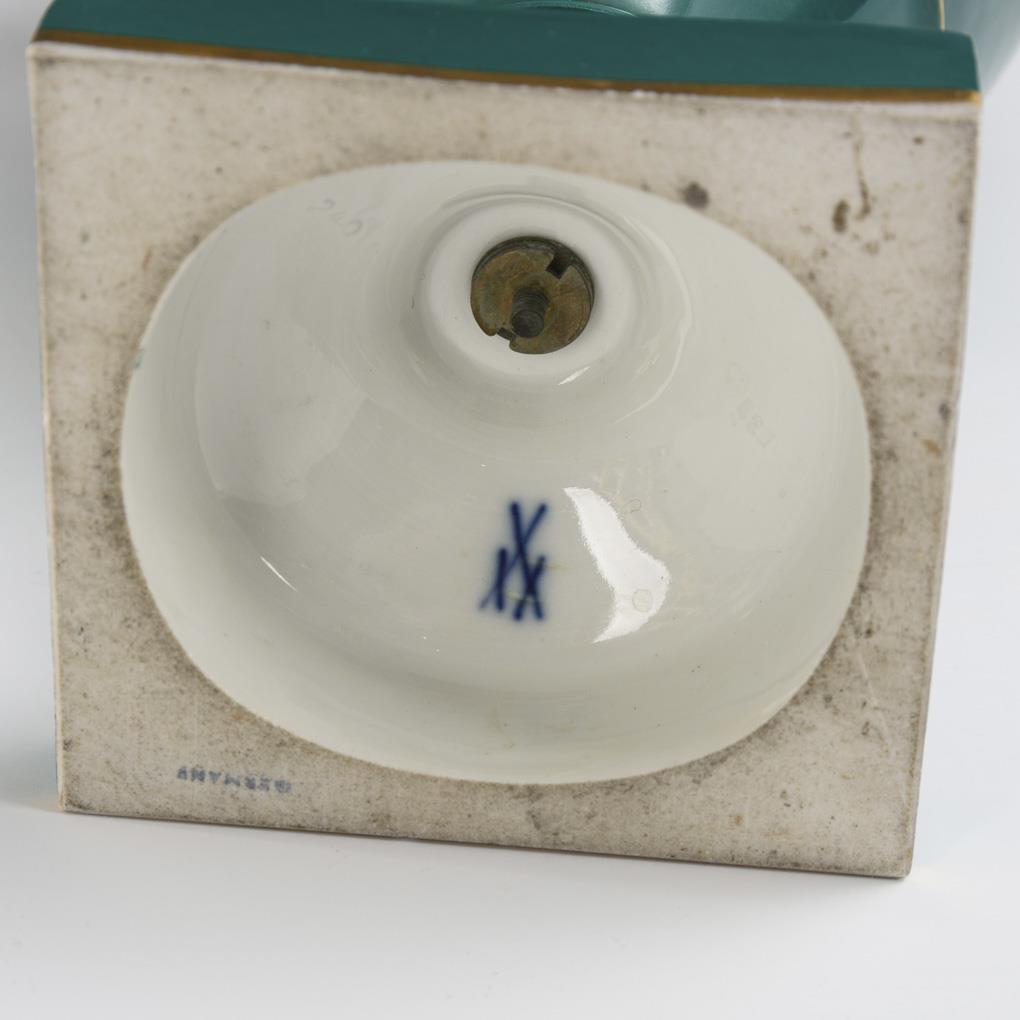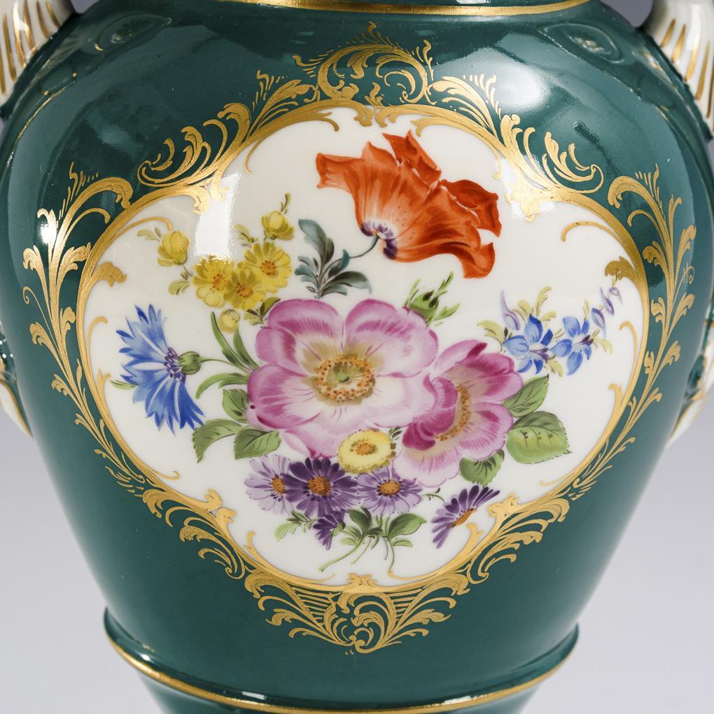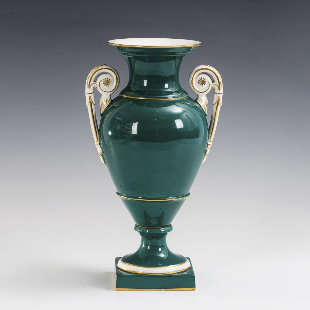 Ovoid body with crater neck, two rosette handles and round foot, on a square plinth. Russian green ground, on the front a gold-framed quatrefoil cartouche with floral painting. 2 minimal chips to the edge of the plinth.