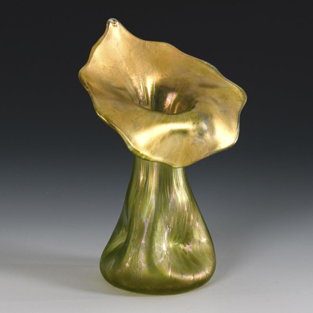 Vase in the shape of a rose spray vessel with a conical, triple-pressed body and a wide flared rim in the shape of an orchid blossom; dislocated neck.
