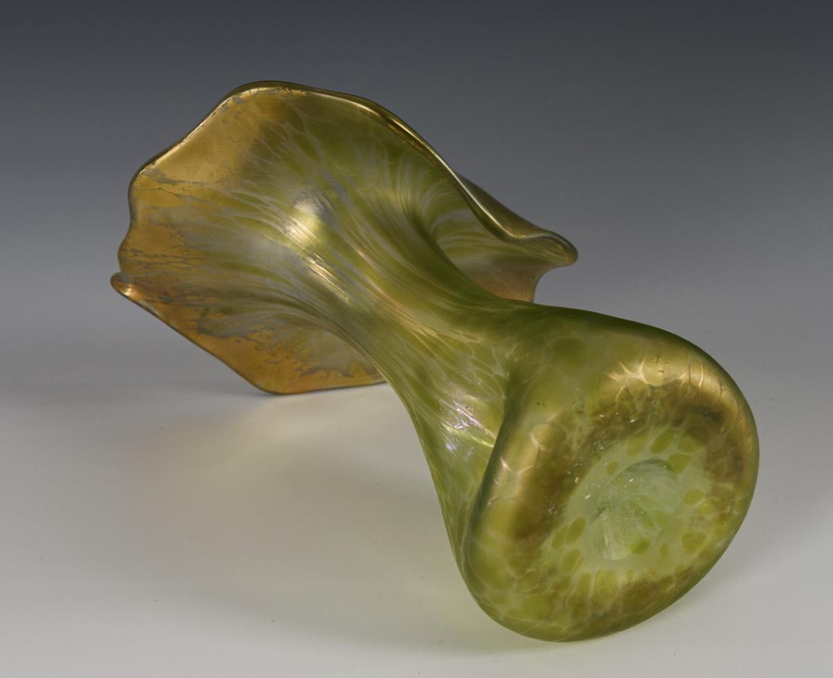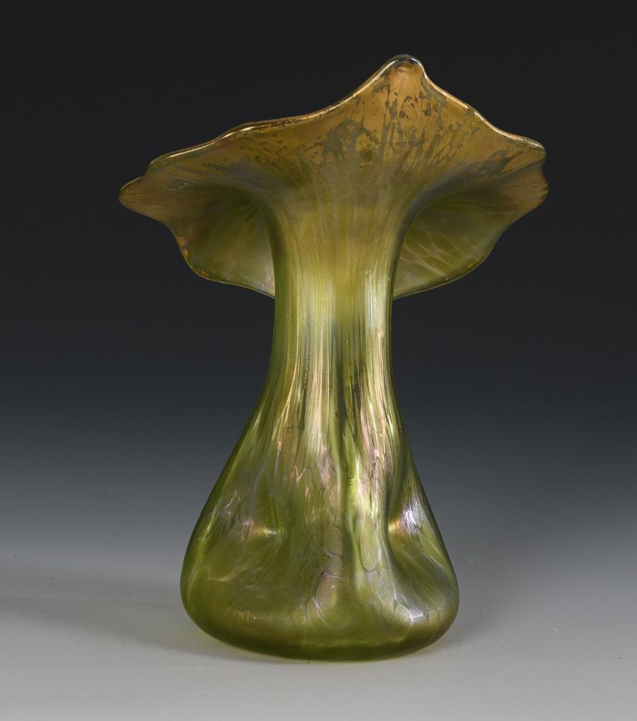 Vase in the shape of a rose spray vessel with a conical, triple-pressed body and a wide flared rim in the shape of an orchid blossom; dislocated neck.