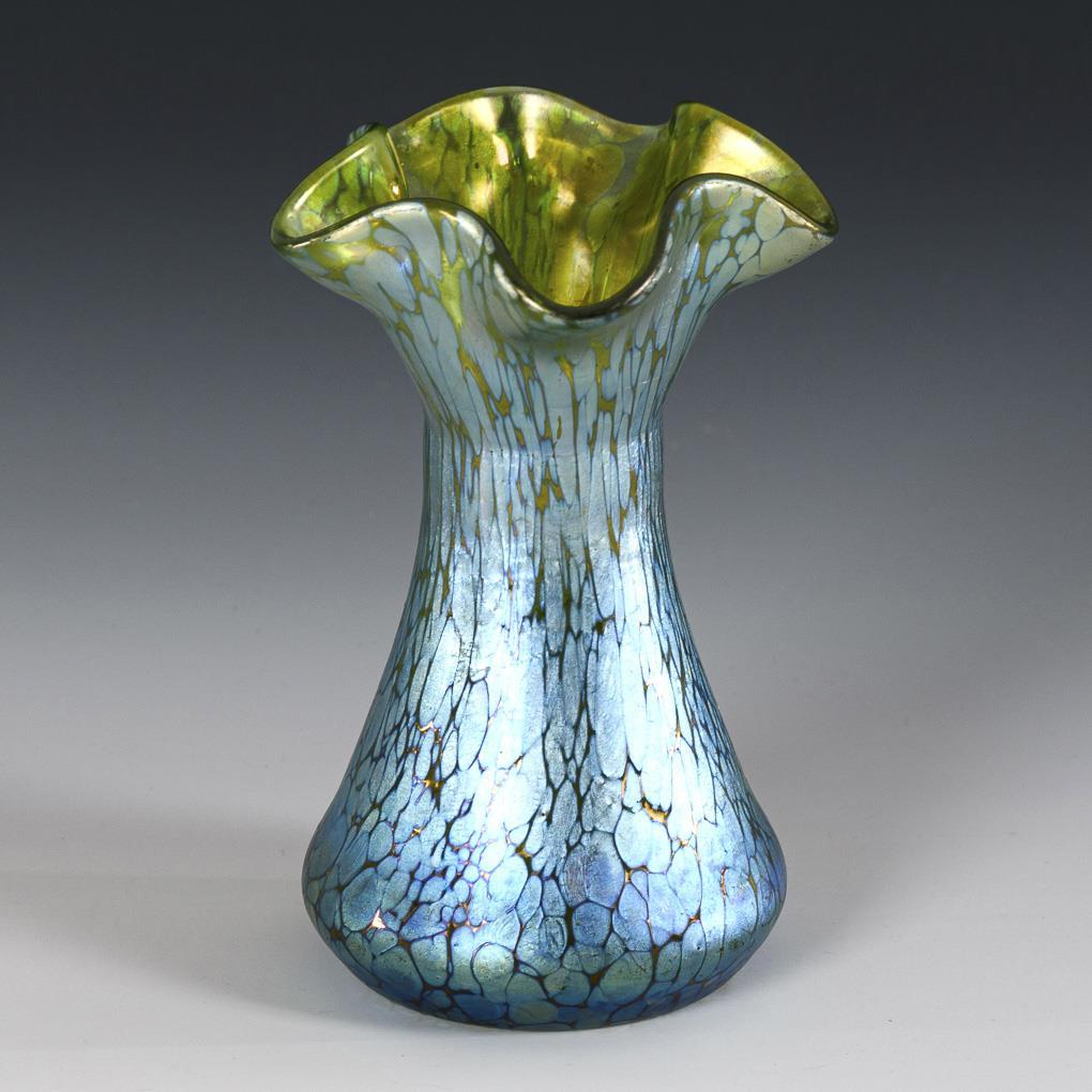 Colourless glass with silver-yellow crumb melts, iridescent. H 12 cm.