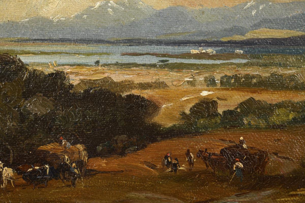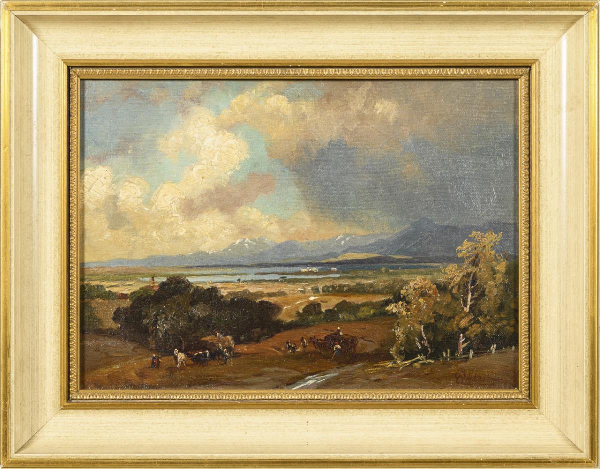 Wide foothill landscape with peasants in the fields near a lake in front of the mountain range.