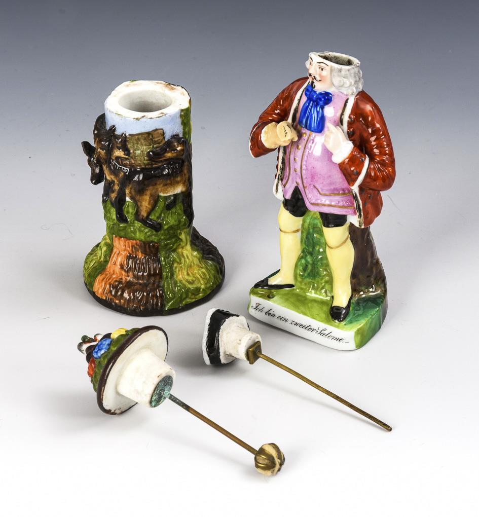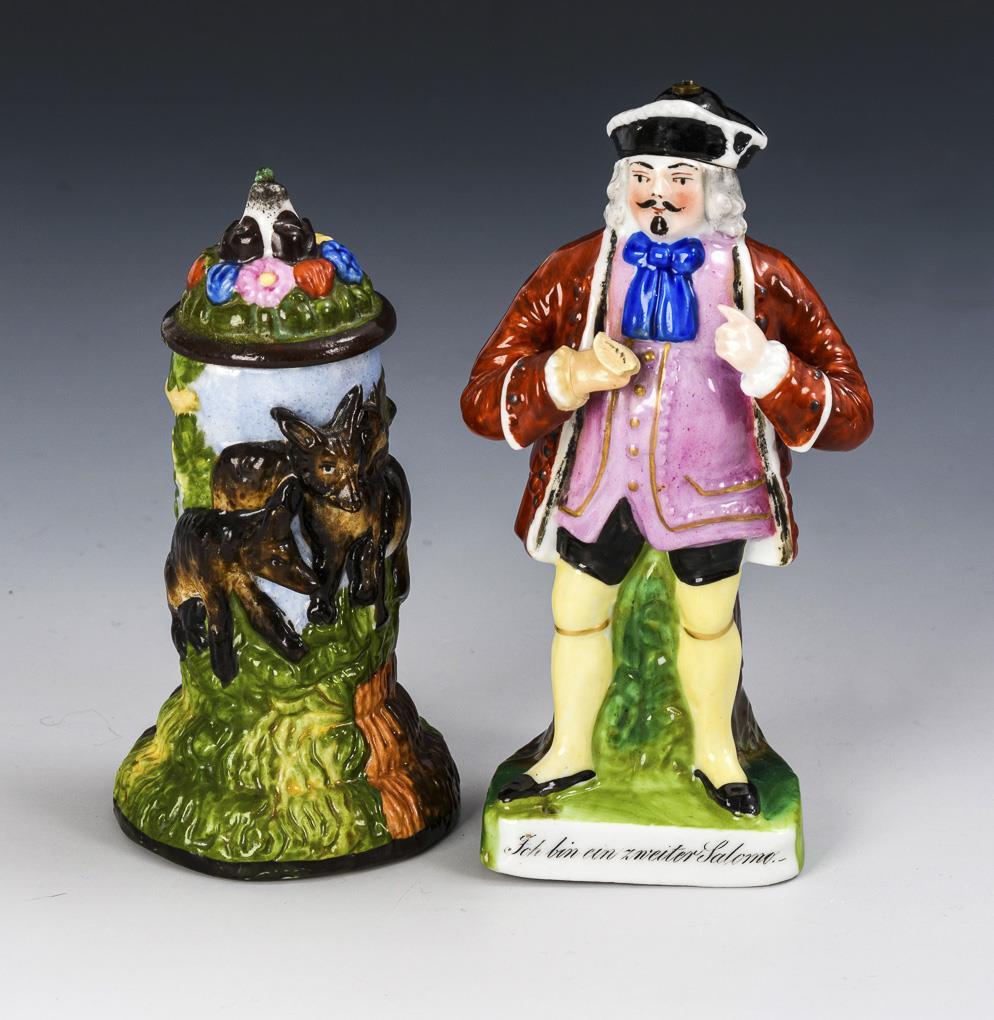1x in cylindrical form with a relief of three wolves on a tree trunk, lid with ignition wool / 1x in the form of a man, inscribed on the base "I am a second Salome.", hat as lid with stick (holder for ignition wool missing). The man's right hand has been added and bumped.