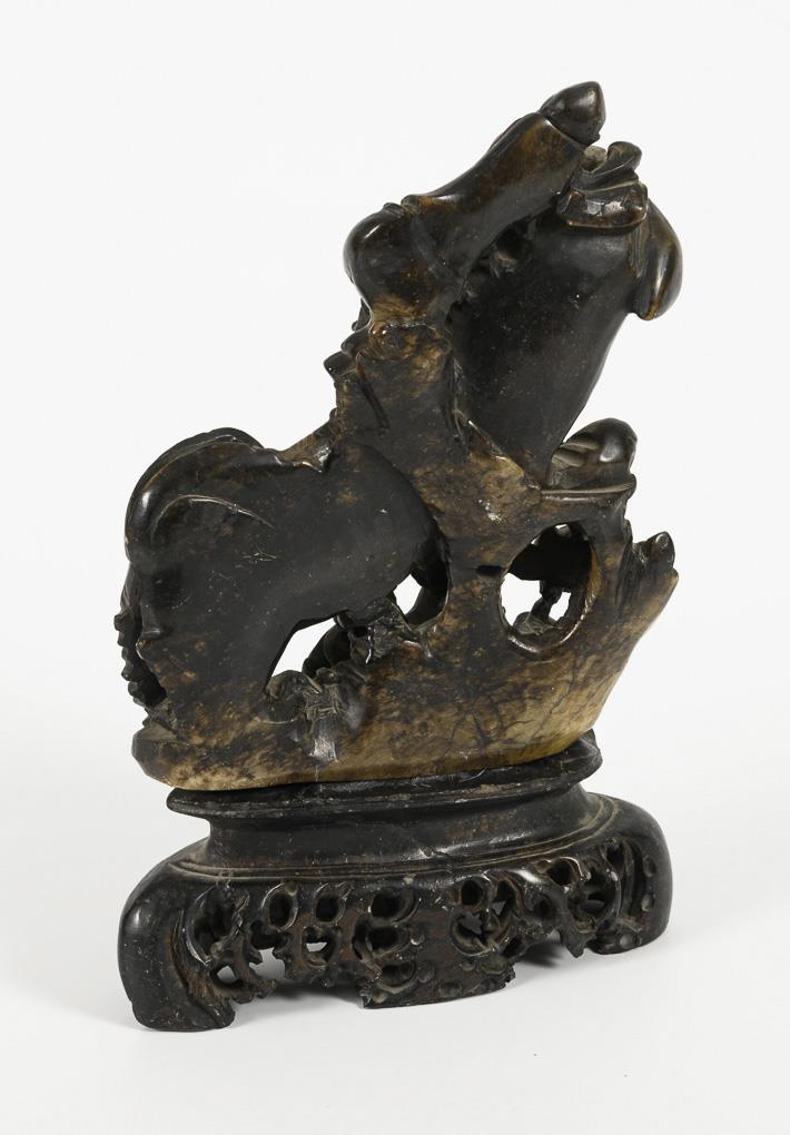 Artfully carved figure of a palace lion or Fo dog with the unusual depiction of a ball and cub together. A clothed monkey rides on its back. In two parts, with an openwork base, this glued.