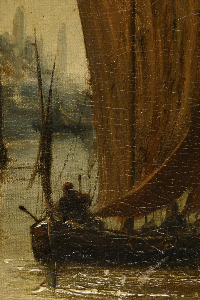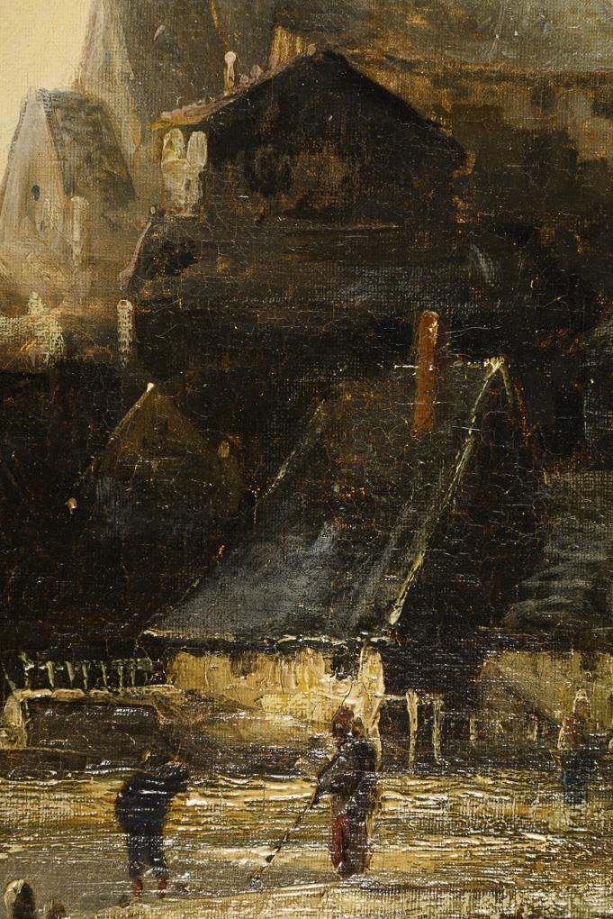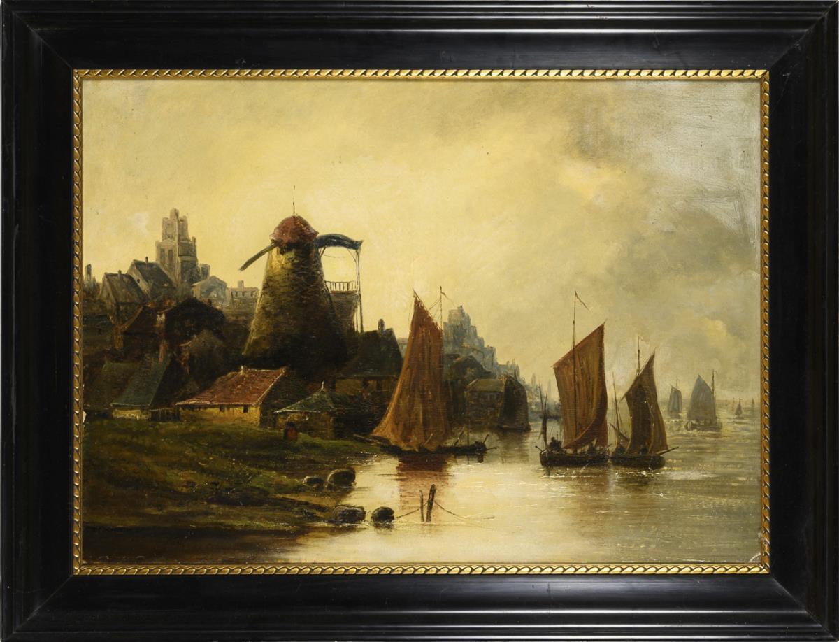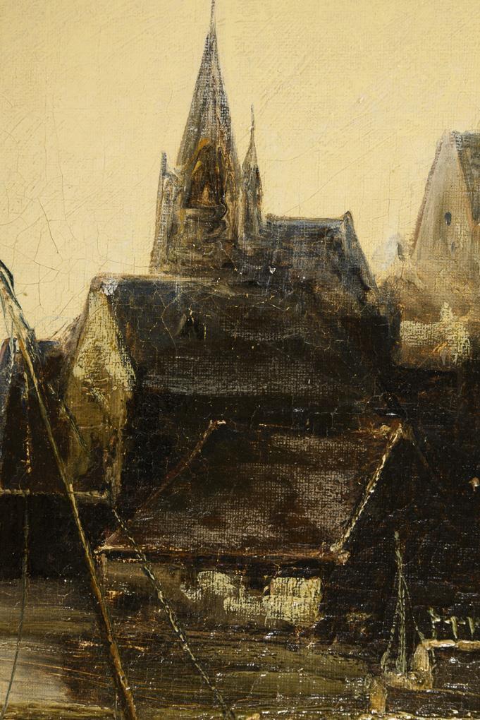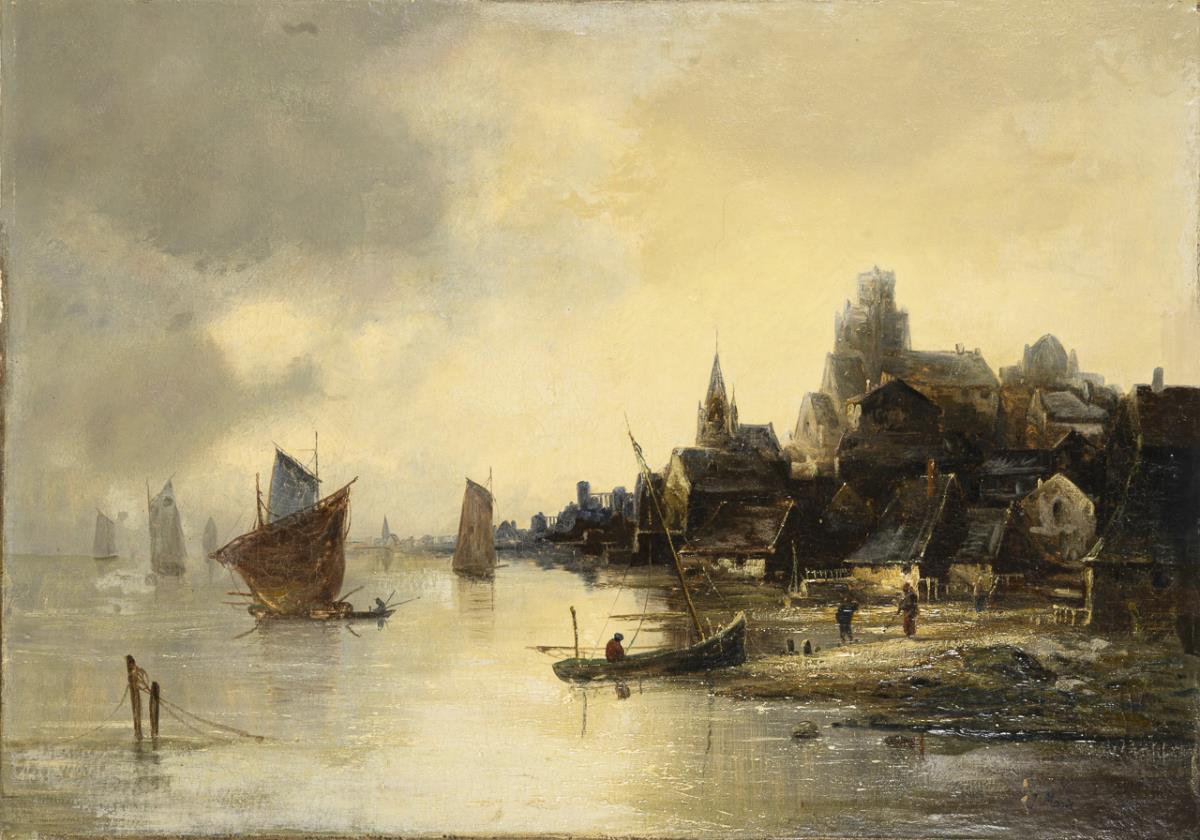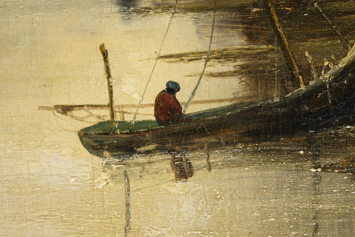 Fishing boats in front of the coastal town under a slightly cloudy sky and several ships near the houses on the shore under a gray overcast sky. Each restored, canvas relined.