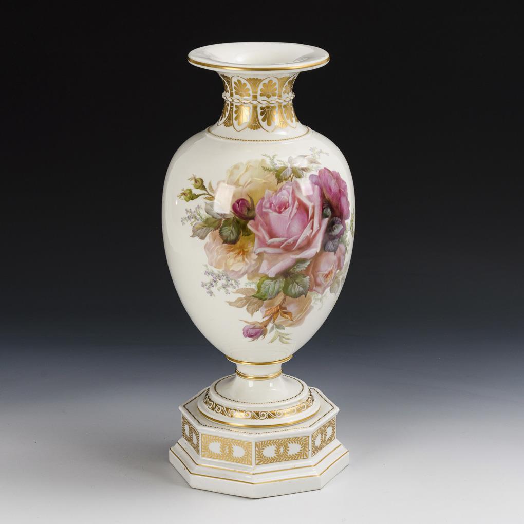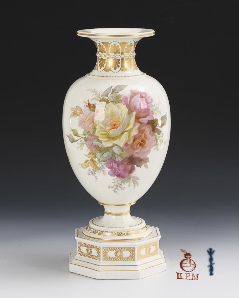 Urbino vase. Baluster body with crater neck and round foot. On an octagonal base. On both sides a lavish bouquet of roses in the style of soft painting in the manner of Paul Miethe (1864-1914), on the neck, round foot and base gold-painted Art Nouveau ornamentation.