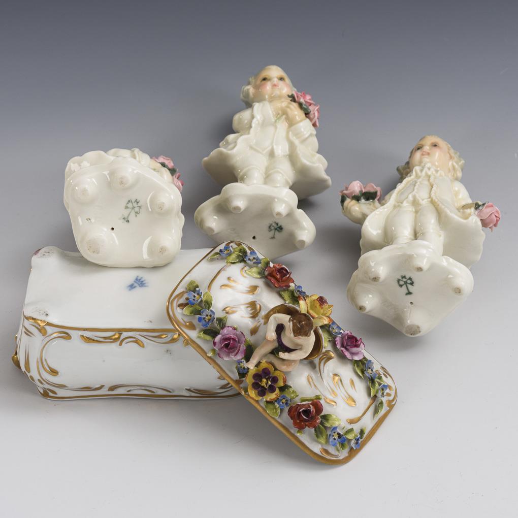 3x ENS: Rococo children with bouquet of roses (h approx. 12.5 cm). / 1x Naples mark: rectangular box with flower covering and a putto as lid knob (h 9.5 cm). Some flowers bumped.