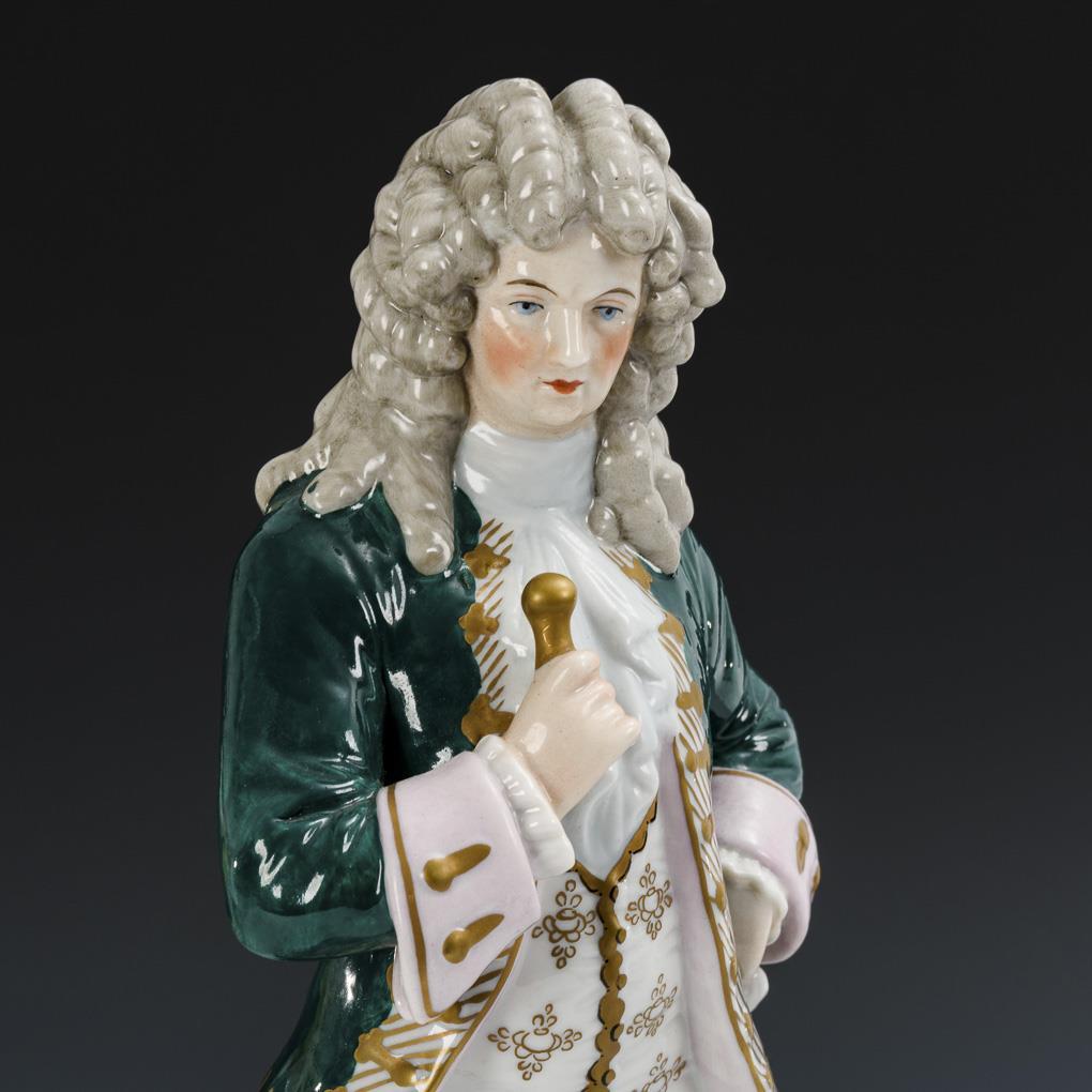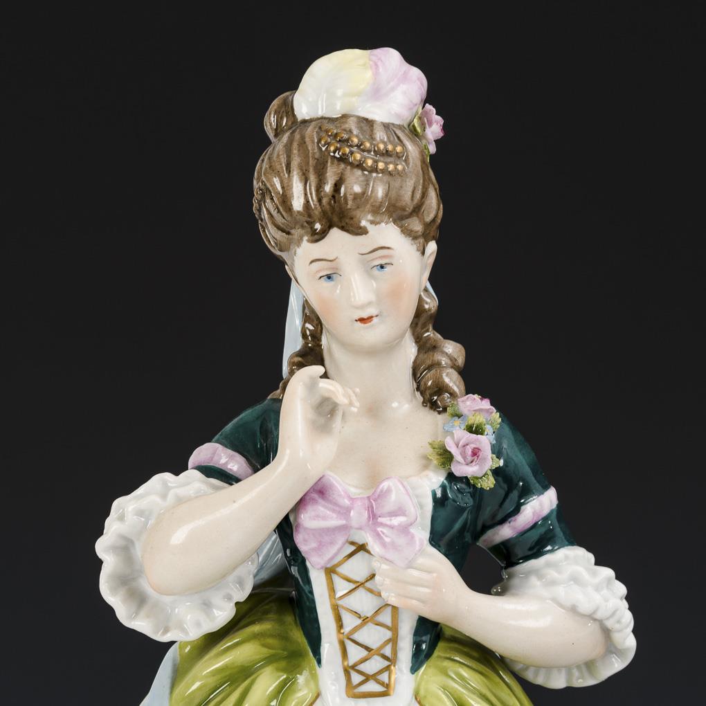 1x figure of a rococo cavalier kneeling on a stool with staff / 1x rococo lady with cupid boy at her feet. Master's staff missing.