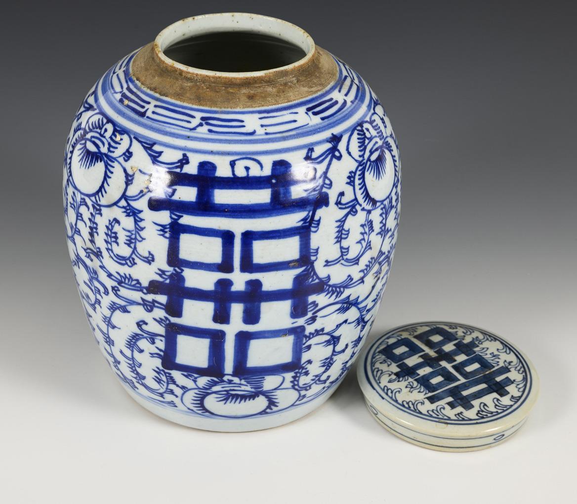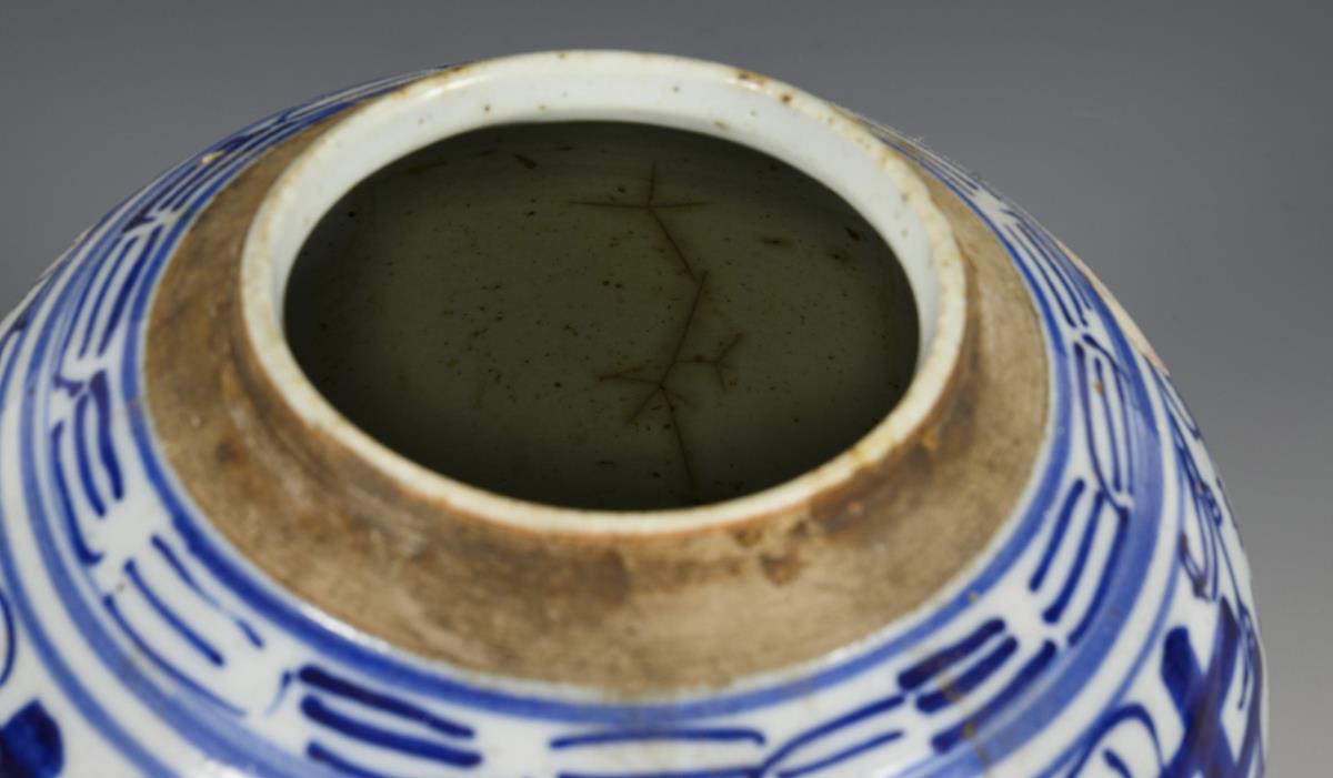 Bellied vessel with underglaze blue painting. Vines and the character hsi for double joy on the wall and lid. Lid with matching lettering and ornament, but slightly different shade of blue.