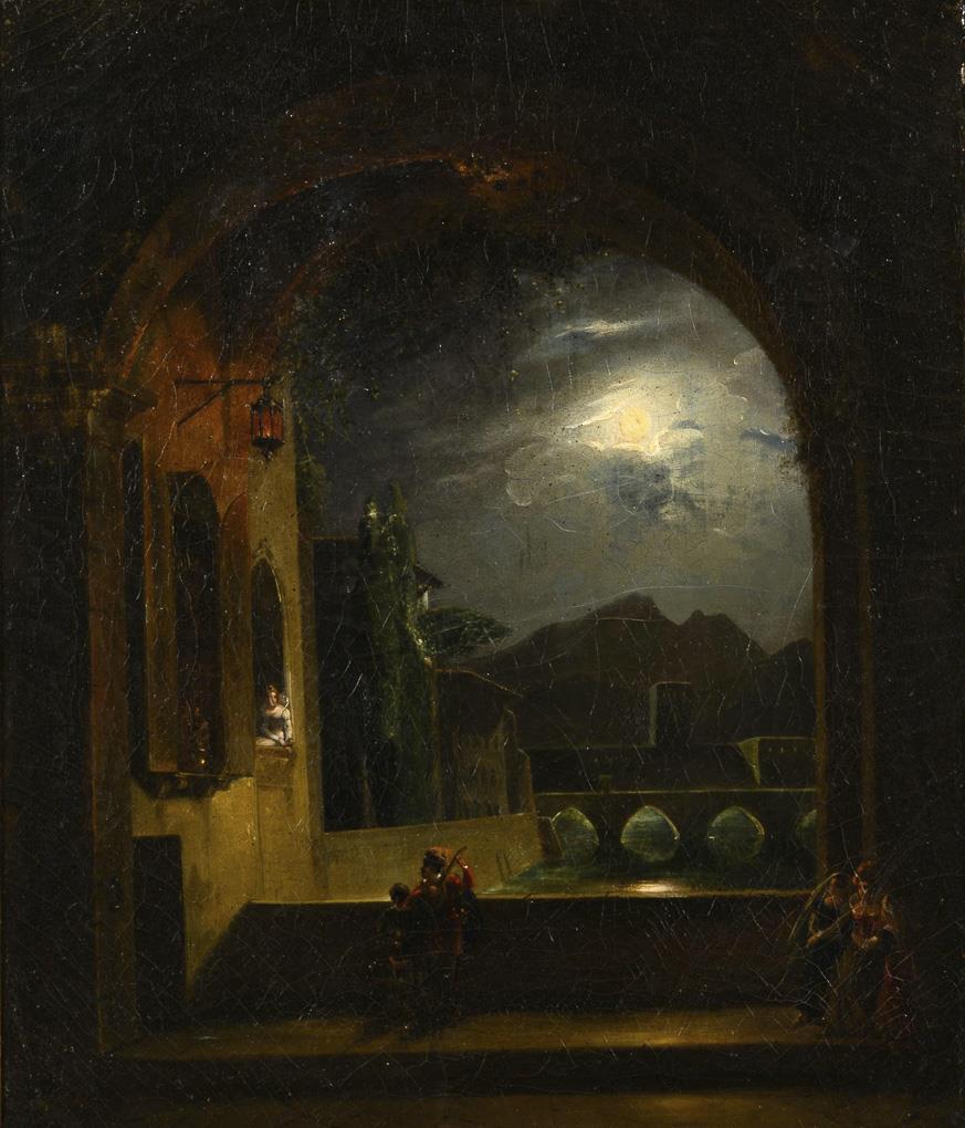 Musician in the moonlight under the window of a noble lady with approaching women from the darkness. Ageing.