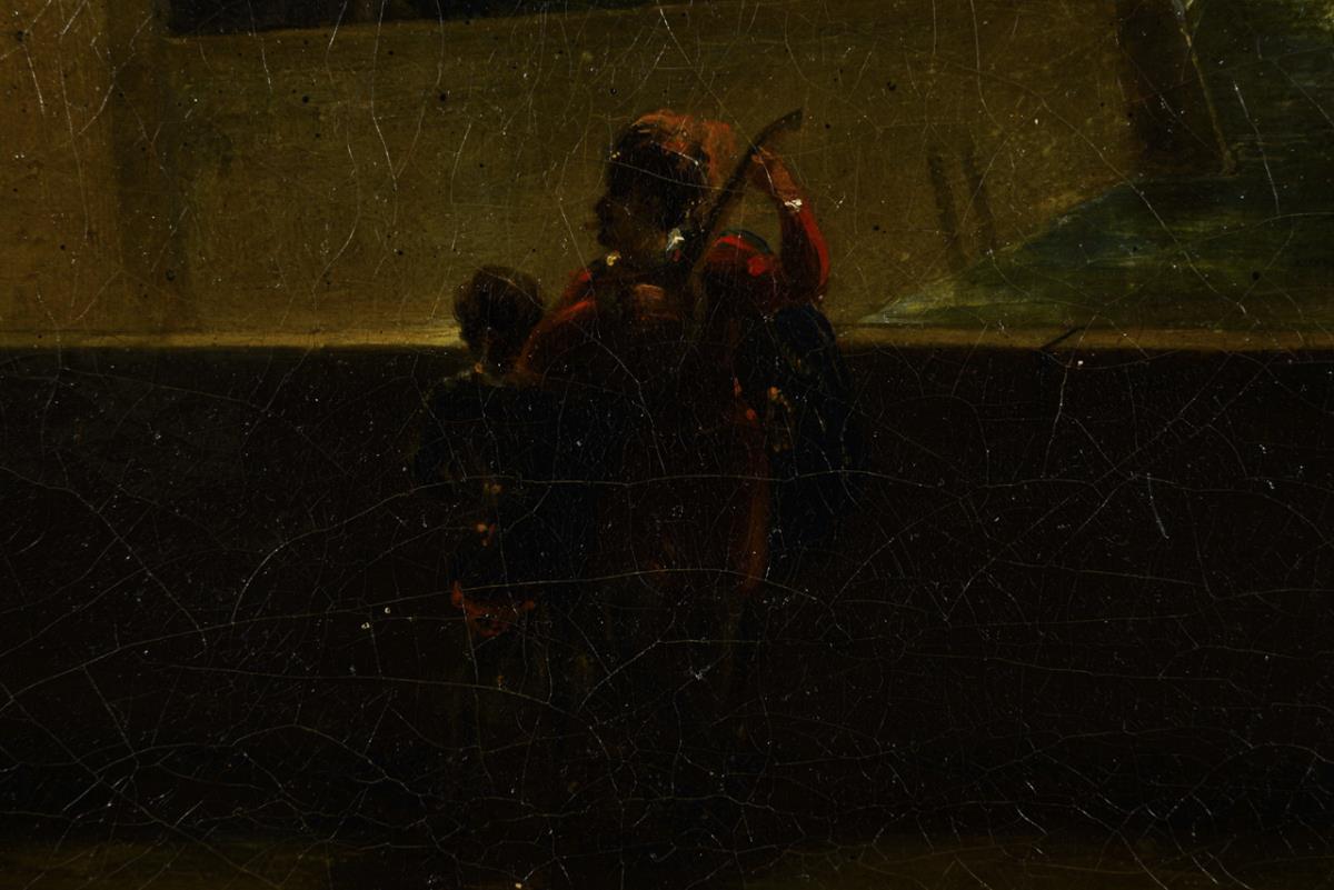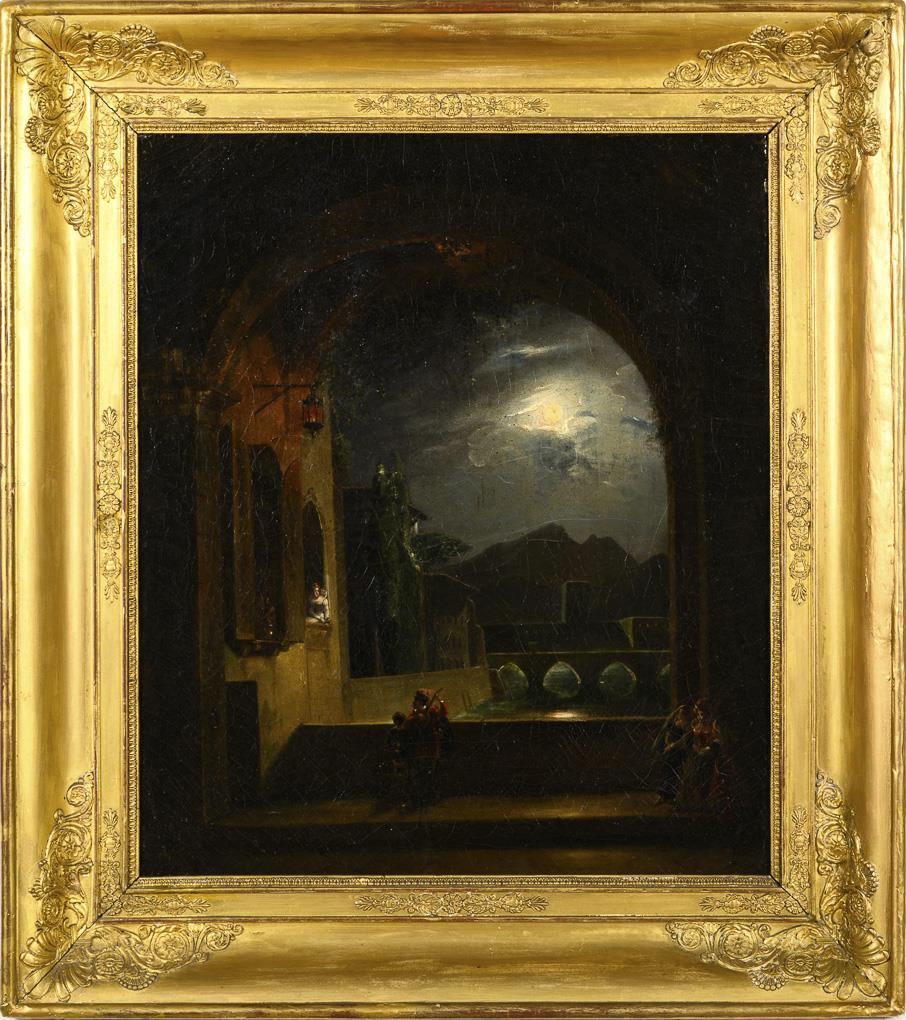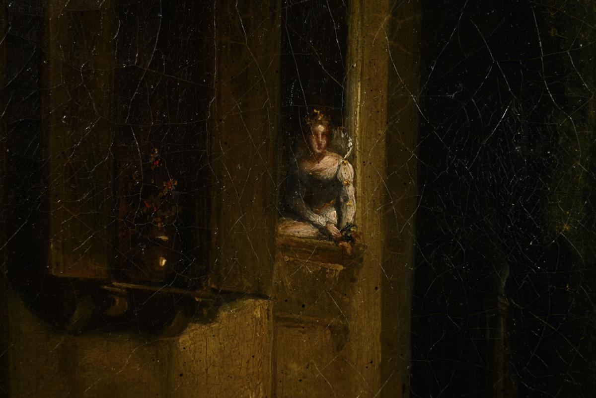 Musician in the moonlight under the window of a noble lady with approaching women from the darkness. Ageing.