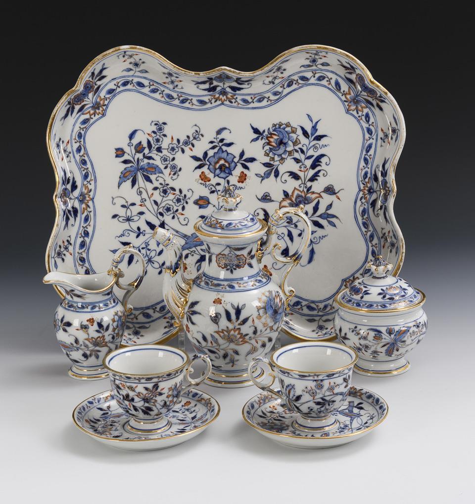 8 pieces. Coffee pot (h 19.5 cm), milk jug, sugar bowl, 2 cups, 2 saucers and 1 tray (31 x 36.5 cm). Lid noses chipped, partial gold abrasion, 1 cup rim restored.