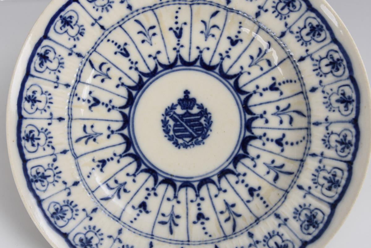3 salad plates with broken ribbed walls. Between vegetal painting a mirror medallion with the Saxon coat of arms.