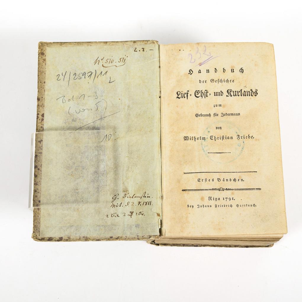 3 volumes in one book on Livonia, Estonia and Courland. Light cardboard binding. Partly browned, binding with signs of age/use.