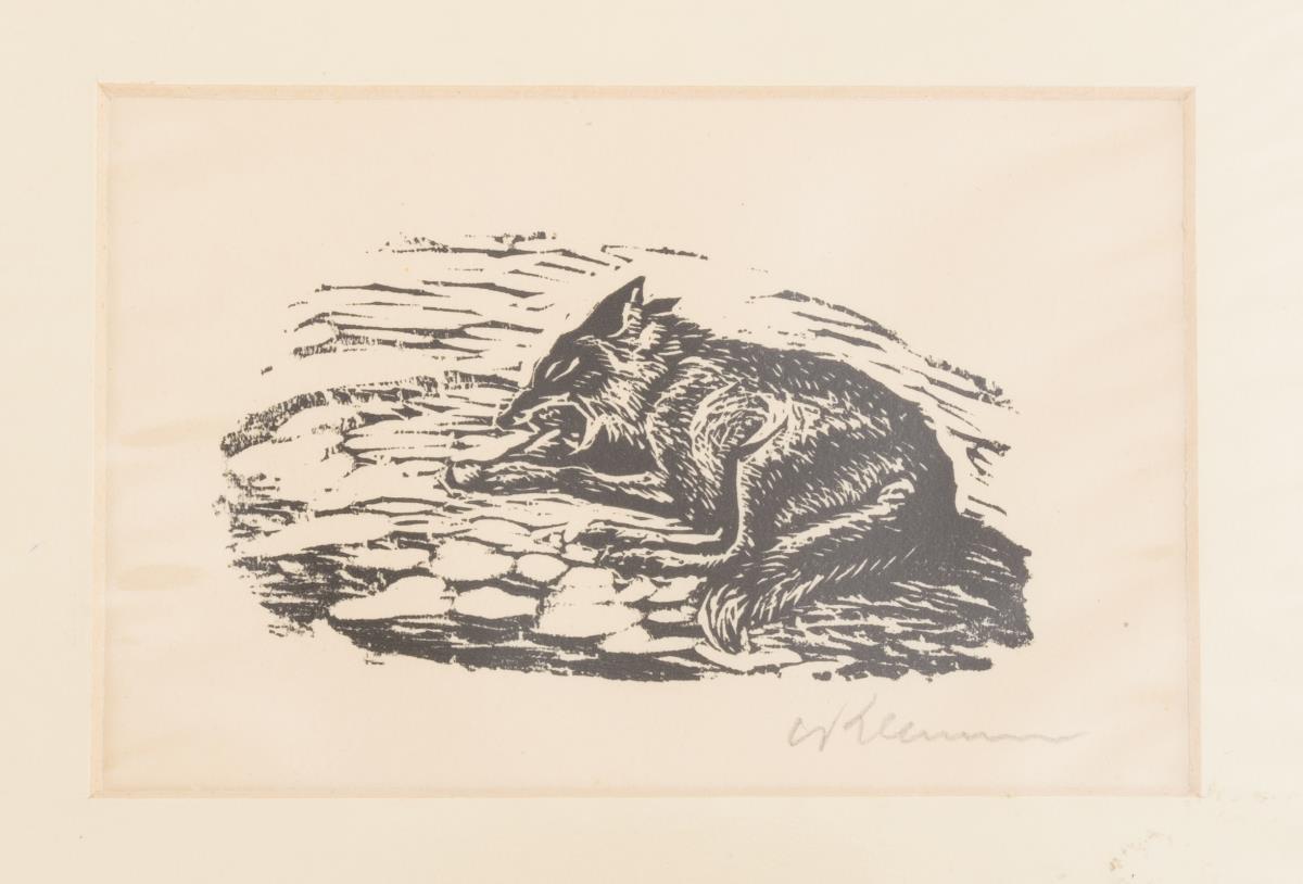 13 kunstvolle Tierdarstellungen auf Einzelblättern aus dem Zyklus "Reinecke Fuchs": Widderkopf, schnuppernder Fuchs, steigender Bock, Fuchs der Türglocke gefangen, tote Krähe, Löwenkopf, Fuchs im Brunneneimer, rennender Hund, kämpfender Fuchs und Hase, Wolf und Fuchs sich streitend, fliehender Fuchs, liegender Fuchs, erhängter Fuchs.