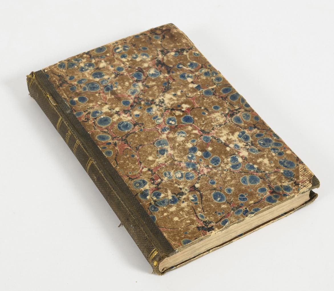 Title page with Hebrew stamp in red. 240 pages, bound folding map of Egypt. Paperback with marbled paper and brown spine. Slightly browned, endpapers slightly torn, binding with signs of age/use.