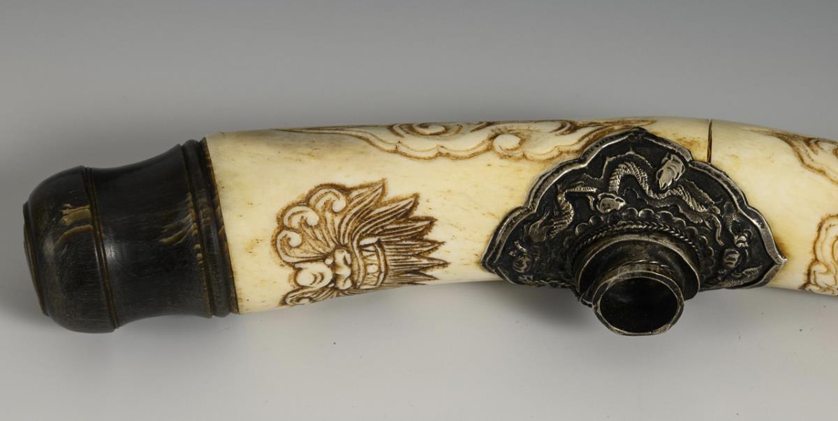 Pipe assembled from three parts with bas-reliefs of various scholars and characters. Horn finials. On a carved wooden stand.