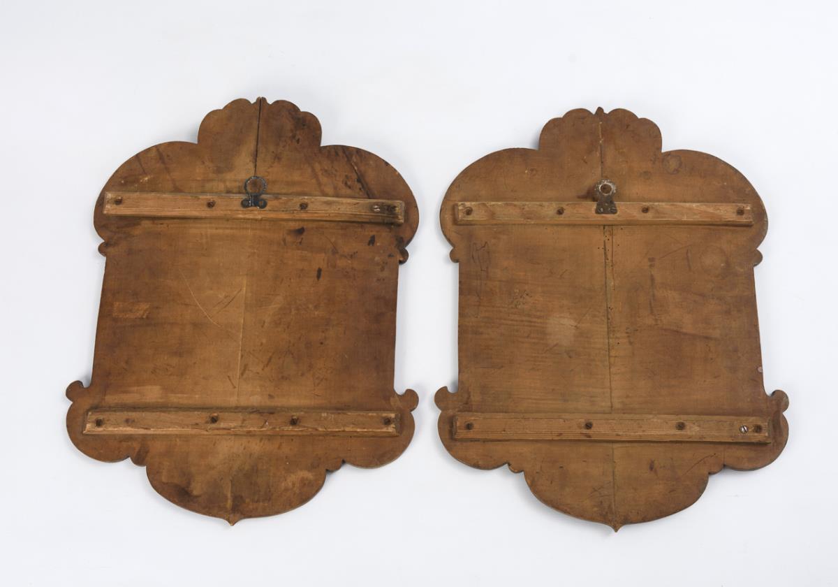 Curved shields with crown and rocaille framing. Each full coat of arms with crest and crest decoration: divided shield with horn and rose or unicorn and Luther rose. Each warped, some open glue joints, 1 small dry crack, 1x minor traces of anobia, a few traces of age/use.