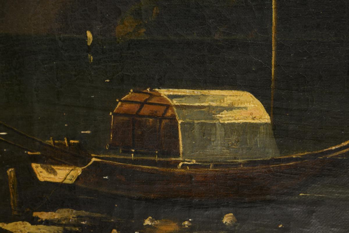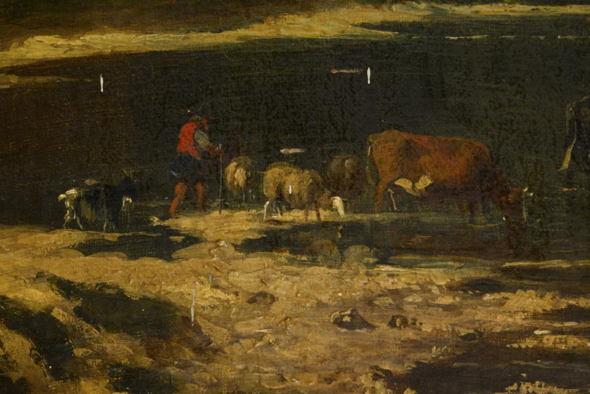 Shepherd with herd of cattle on the shallow bank near the boats in the sunshine before the high peaks of the mountains under a blue sky. Restored, with backing.