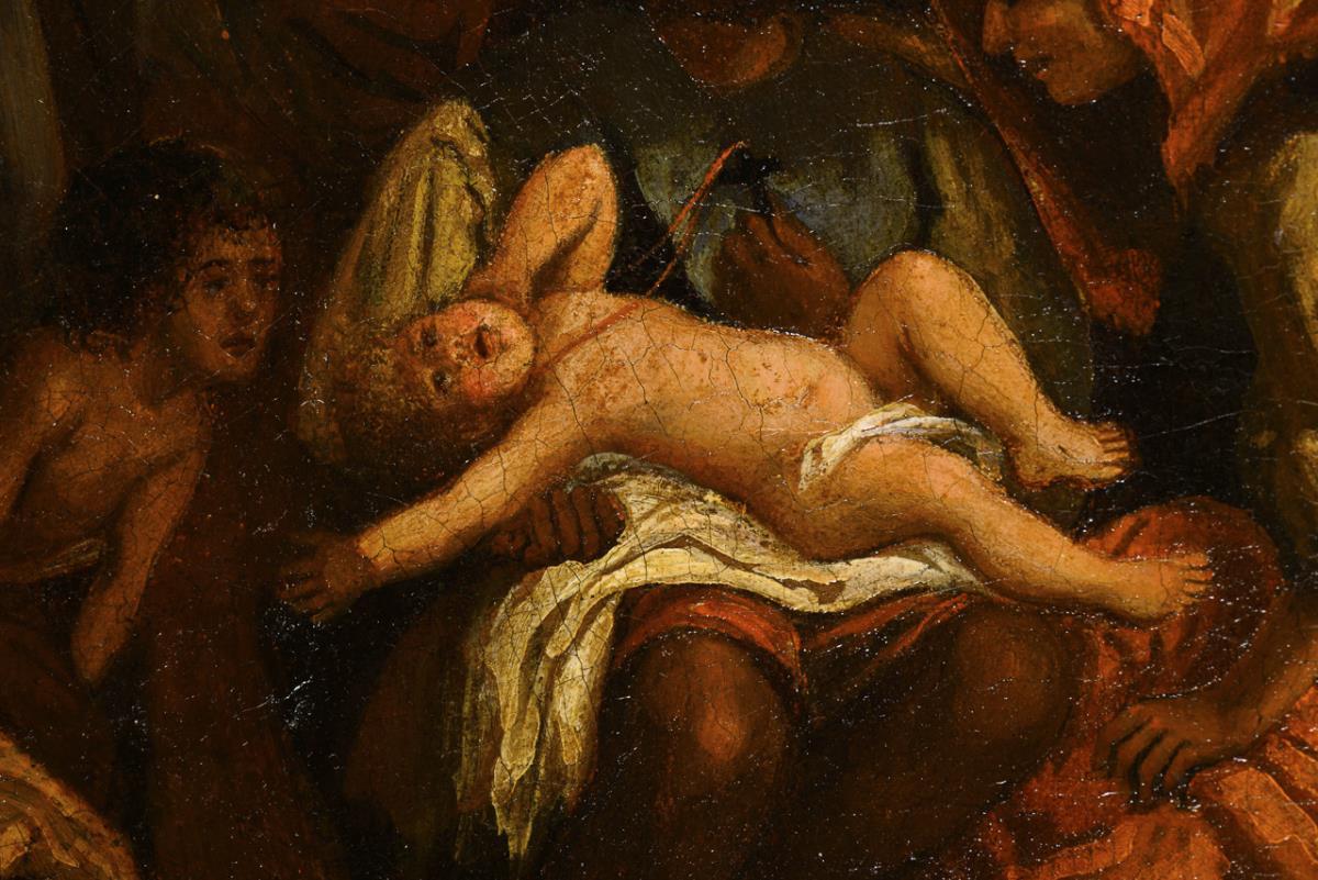 Scene reminiscent of the Nativity with an oriental village community and a newborn child at a thatched house with a fireplace. Doubled canvas.