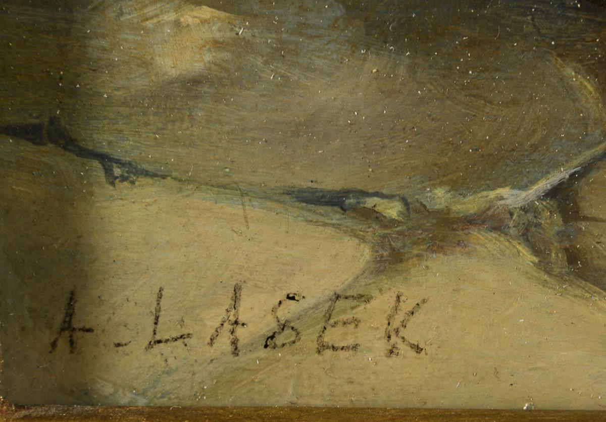 Oil/wood. Signed lower left.
