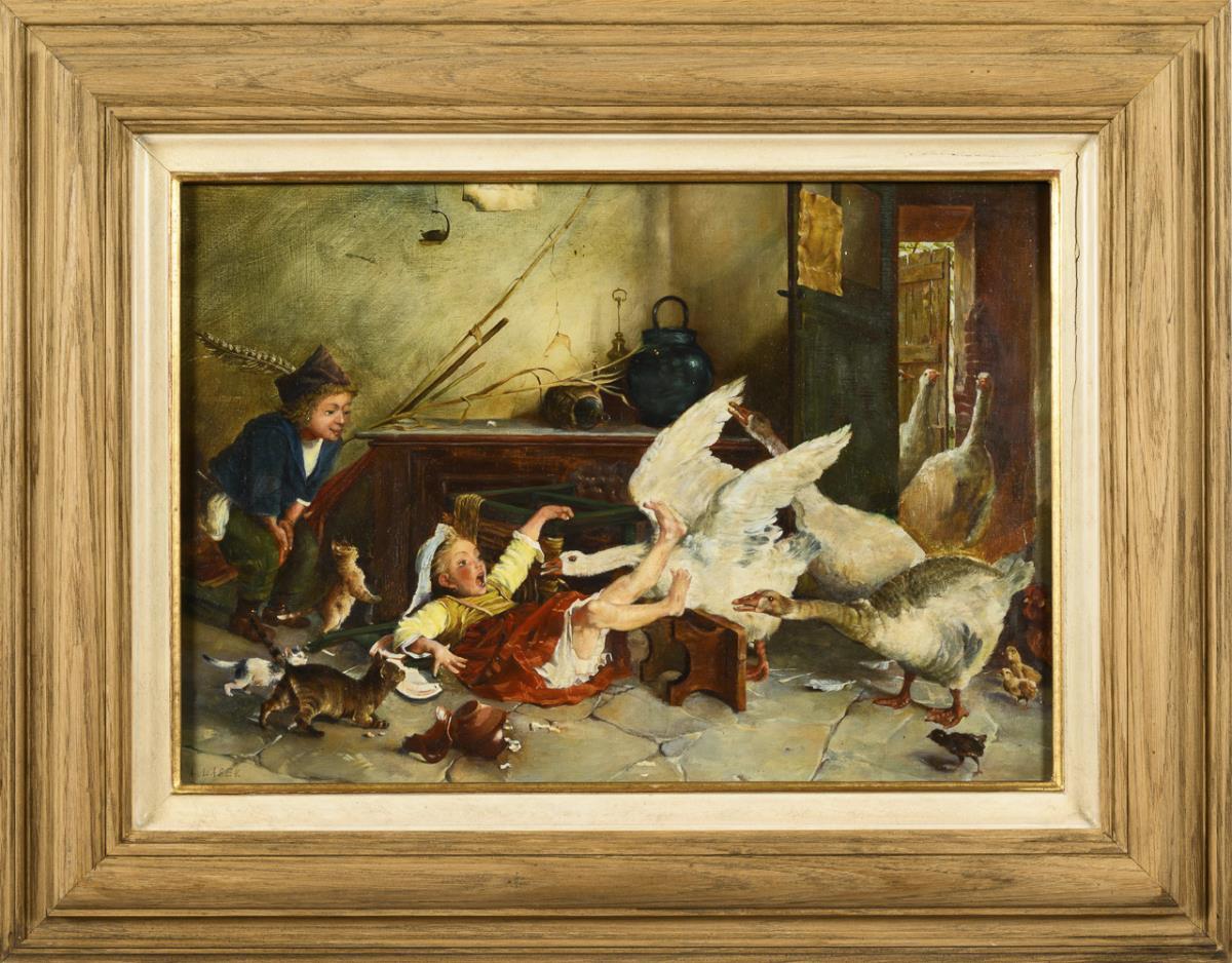 Invading geese in the farmhouse parlor, whereby a child falls from the bench and the cats are startled.