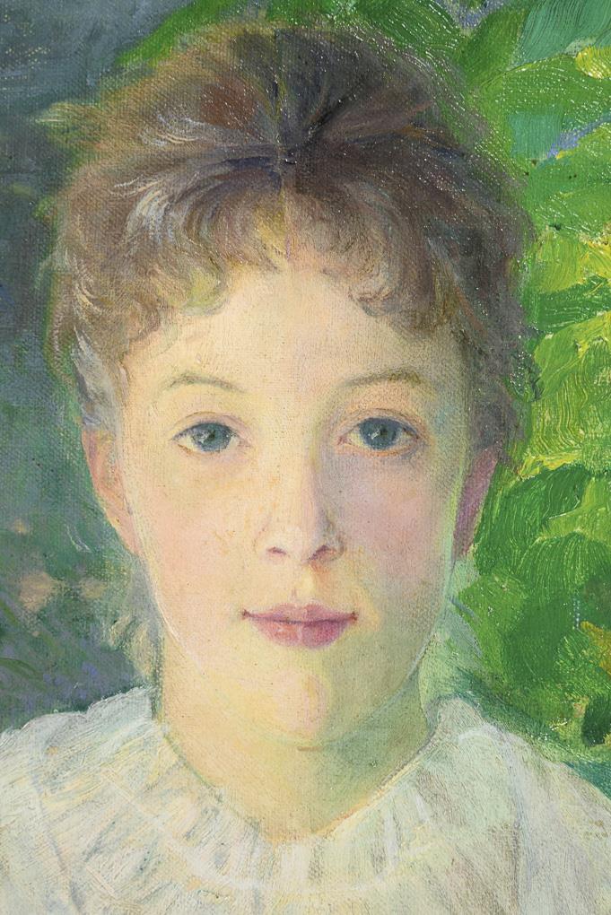 Frontal portrait of a young lady in a pink dress in the shade of a plant in the garden. Punched holes in the corners.